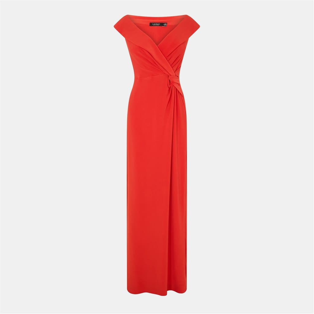 This Lauren by Ralph Lauren gown is a stunning choice for formal occasions. The maxi dress features a sleek off-the-shoulder neckline and a slim fit, creating an elegant silhouette. Its solid pattern and straight hem add to its sophisticated appeal, making it a timeless addition to any wardrobe. -