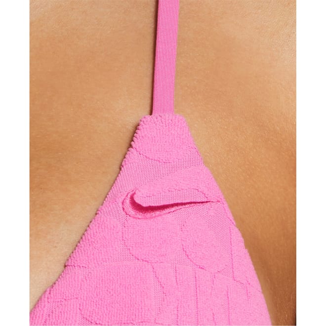 Dive into style with Nike's textured two-piece swimwear, perfect for swimming enthusiasts. This bikini features a tie closure for a secure fit and is adorned with a subtle logo embellishment, adding a touch of brand identity. Ideal for those seeking both functionality and a sleek design in their swimwear collection. -