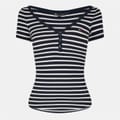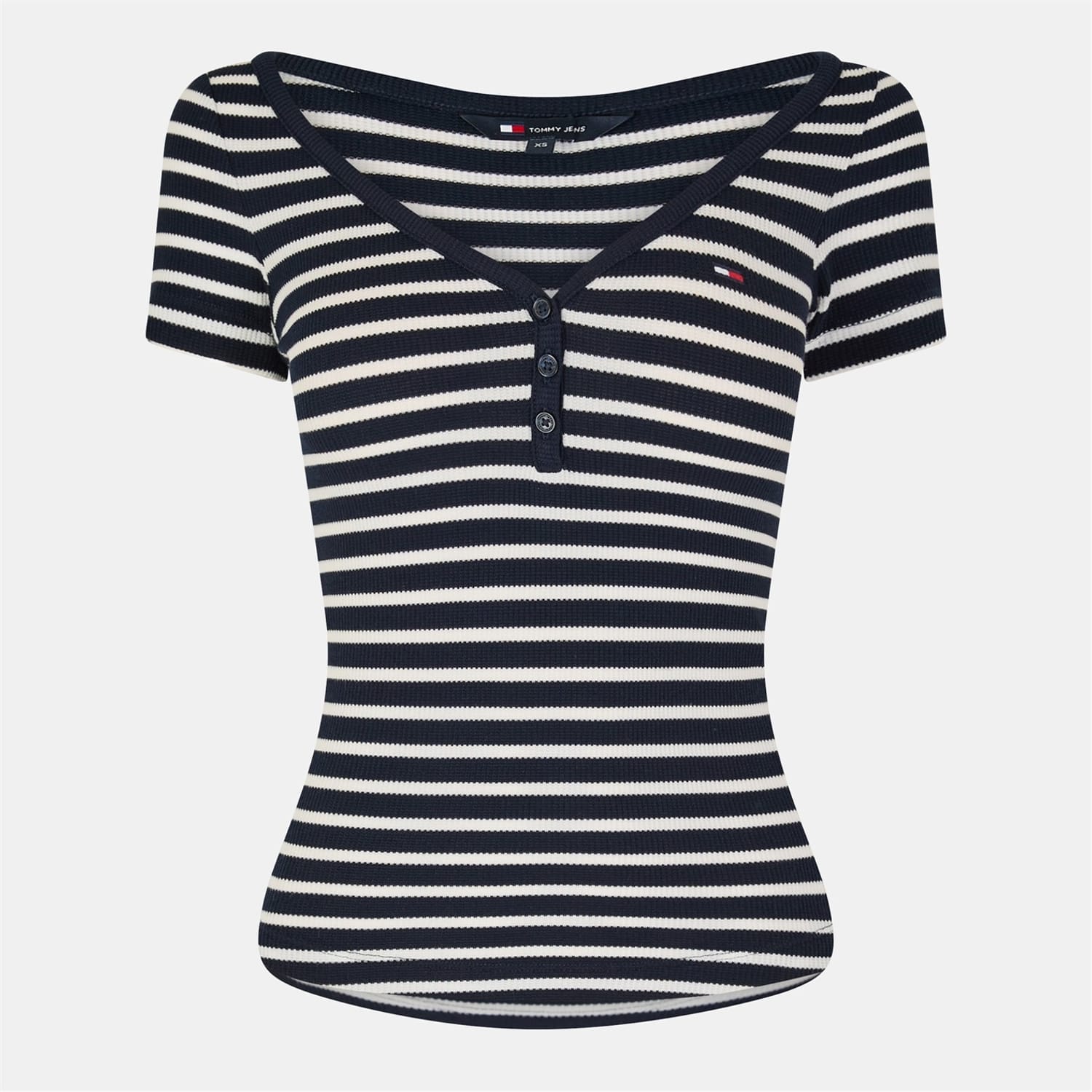 This Tommy Jeans top features a slim fit and a distinctive waffle pattern. It comes with short sleeves and a V-neckline, adding a touch of style. The top is adorned with a subtle logo embellishment, enhancing its appeal. The button closure provides a classic finish, making it a versatile addition to your wardrobe. -