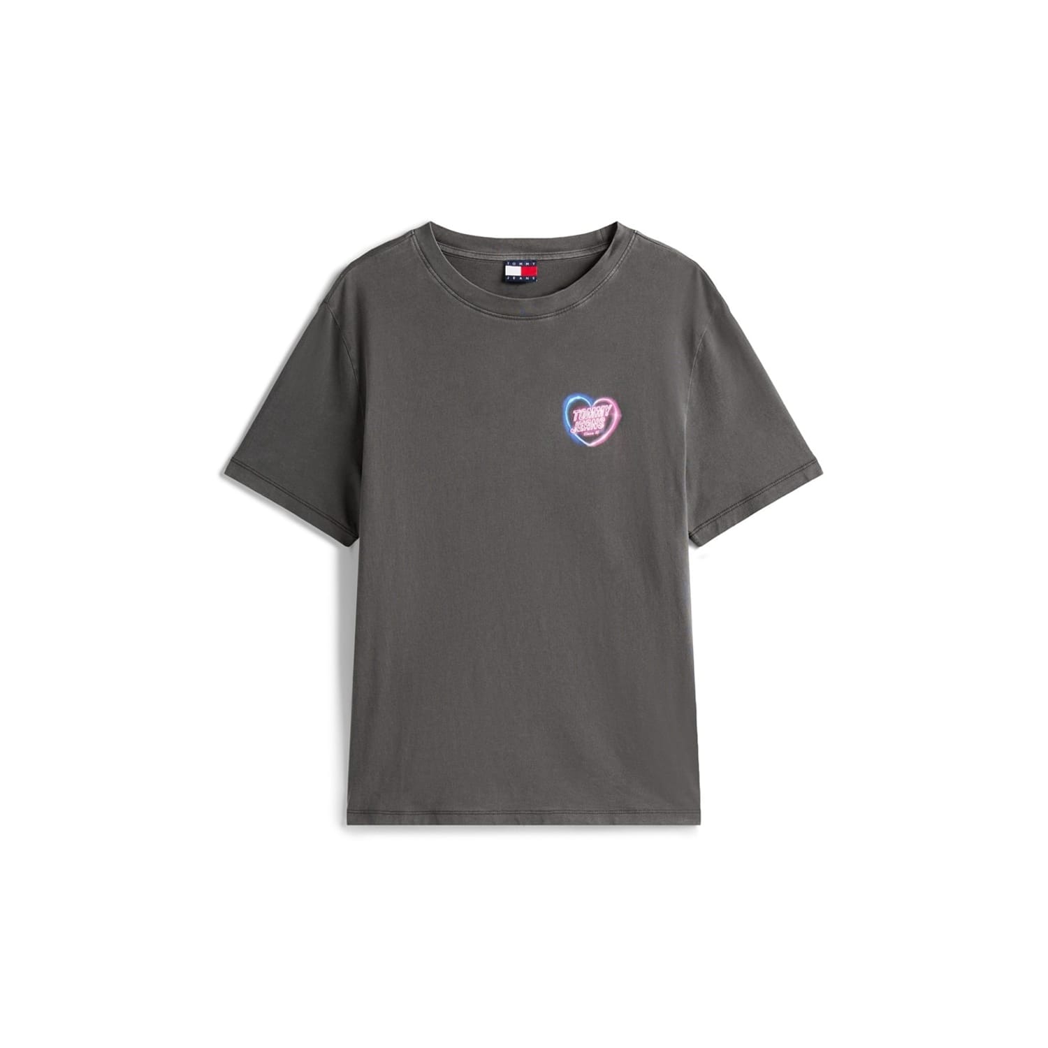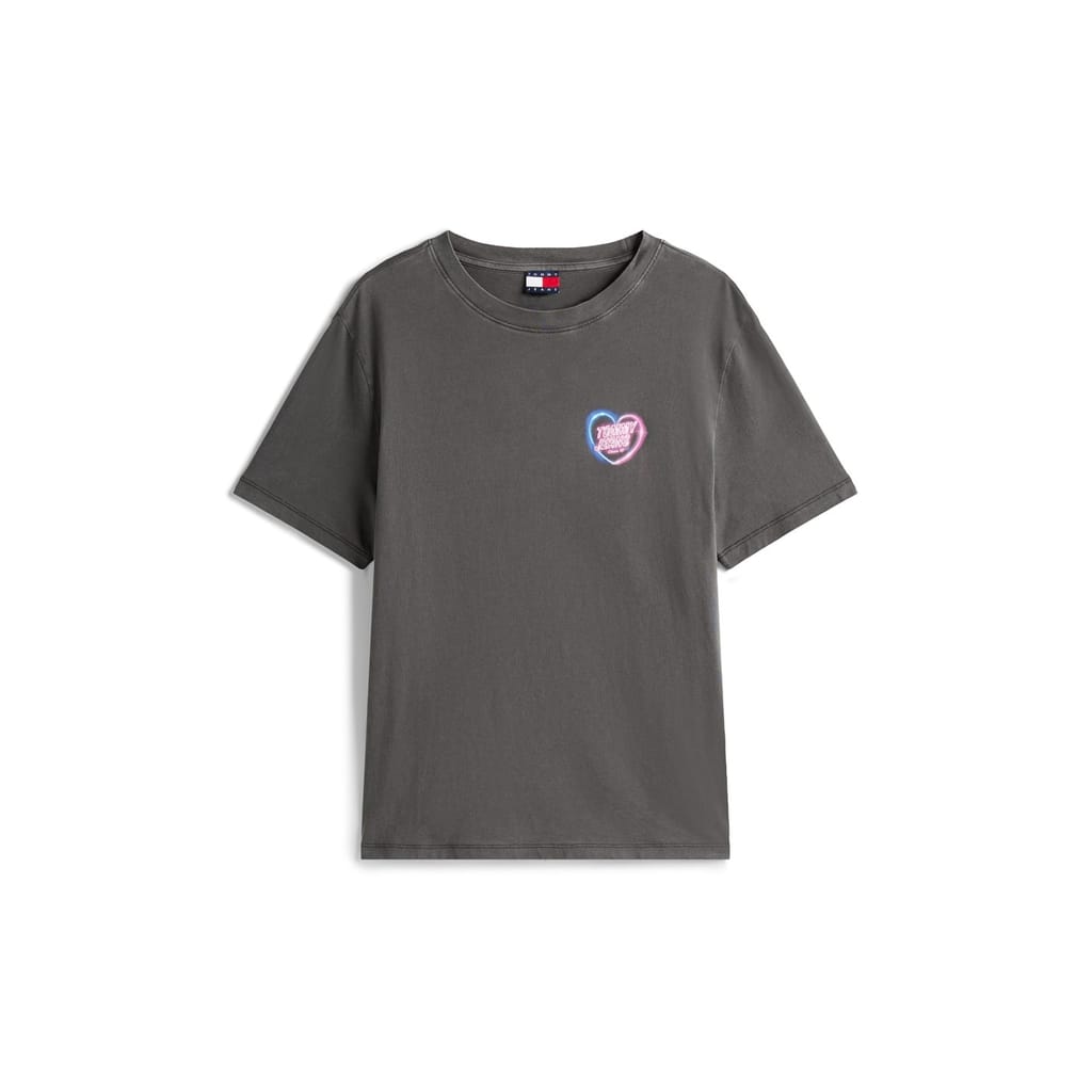 This Tommy Jeans top features a regular fit with a crew neck and short sleeves. Adorned with a heart graphic print, it includes a distinctive logo embellishment, adding a touch of brand identity. -