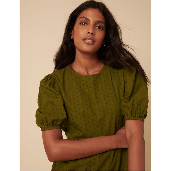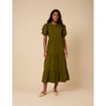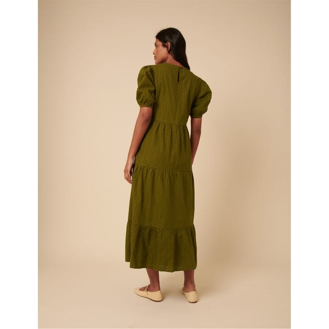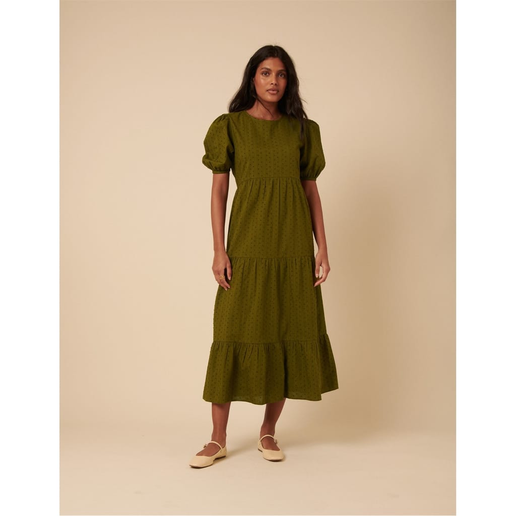The Betty dress by Nobody's Child is a stylish midi tiered dress, perfect for any occasion. Featuring a textured pattern, this dress boasts a crew neck and short puff sleeves, adding a touch of elegance. The ruffle hemline enhances its feminine charm, making it a versatile addition to your wardrobe. -