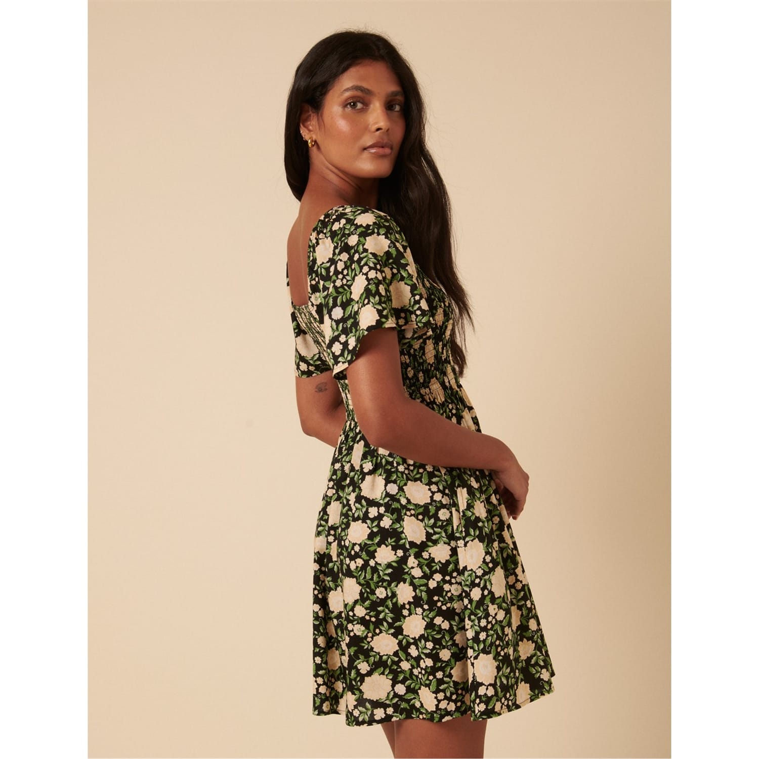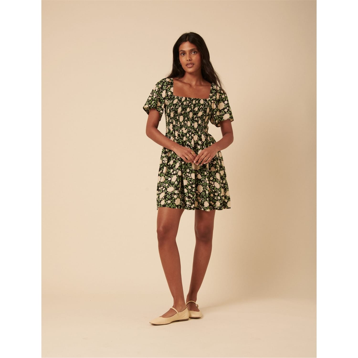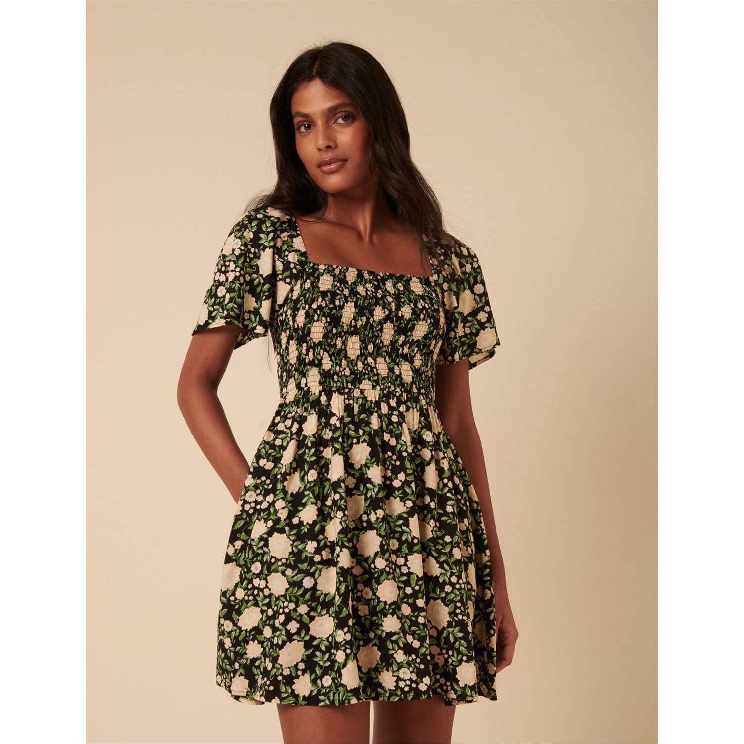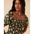 This Nobody's Child mini babydoll dress features a charming floral pattern and a square neckline. The short puff sleeves add a playful touch, while the straight hemline ensures a clean finish. Practical pockets enhance its functionality, making it a delightful choice for various occasions. -