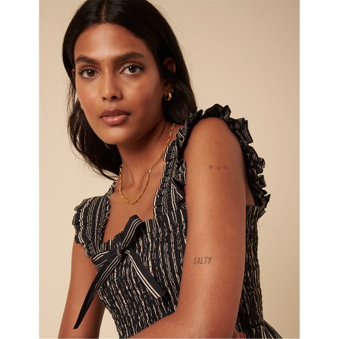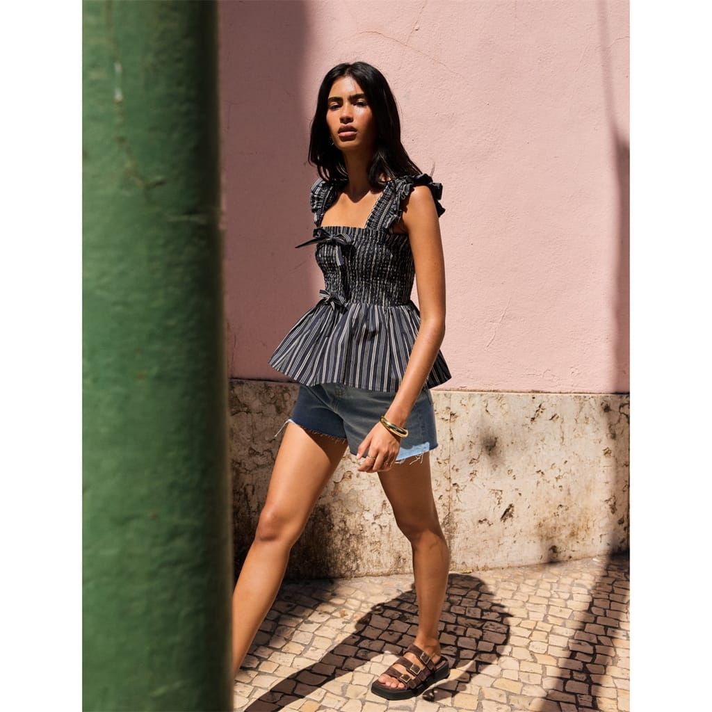 - • Structured peplum detailing defines the waist