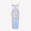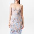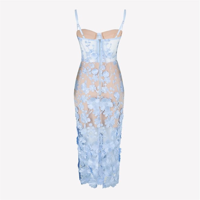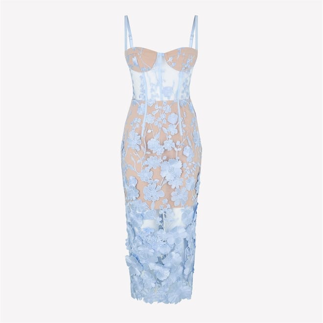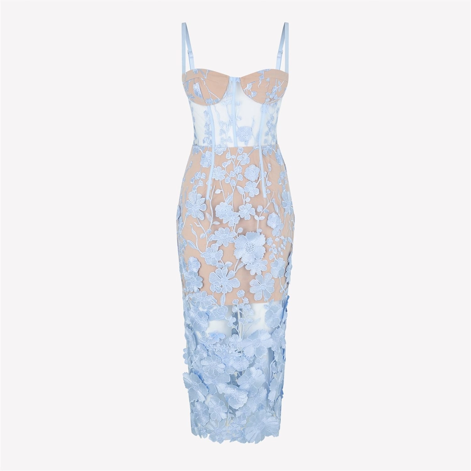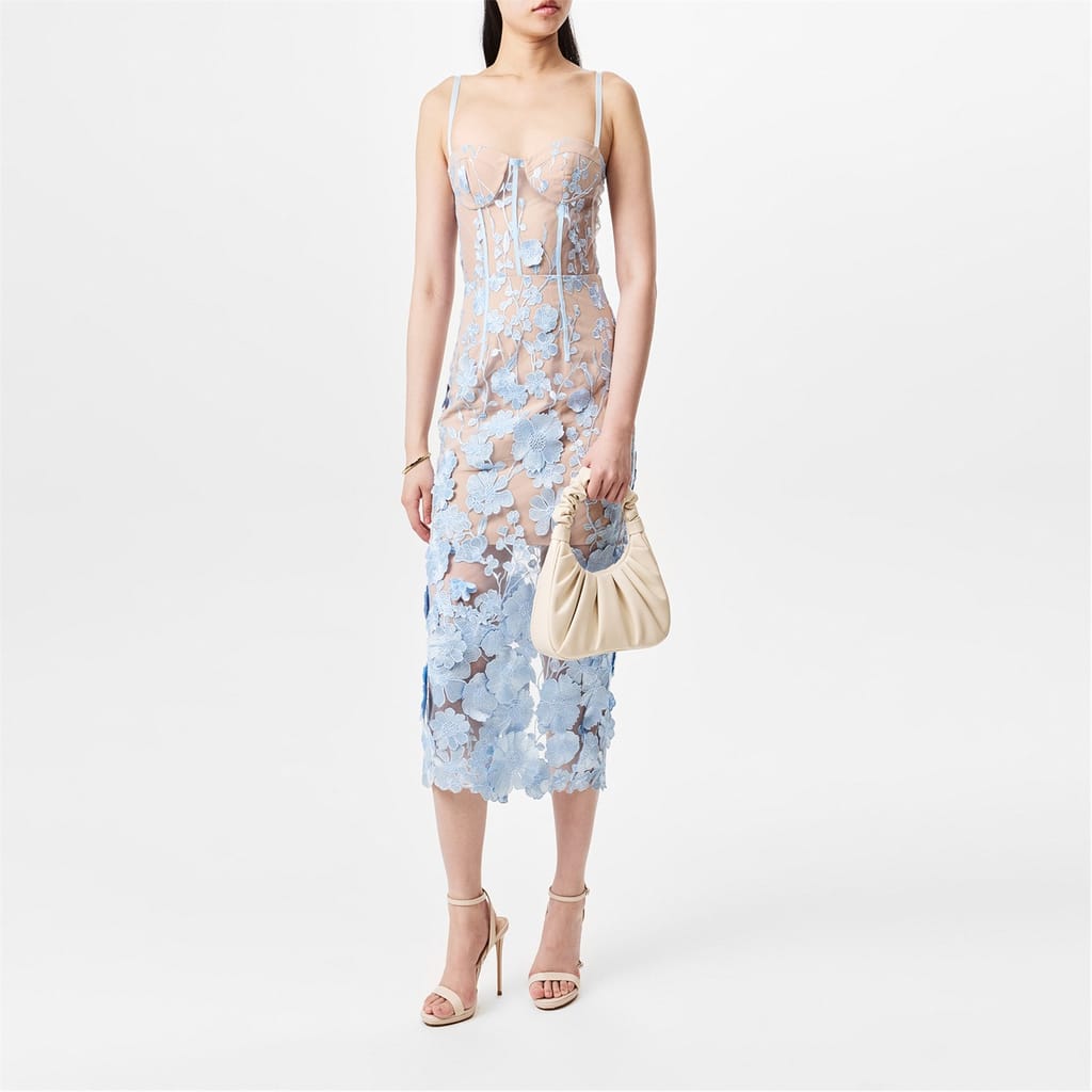 This Jarlo corsetry dress is a stunning midi piece featuring a sweetheart neckline and spaghetti straps. The slim fit design is beautifully adorned with floral embroidery, adding a touch of elegance to its floral pattern. Perfect for those seeking a sophisticated and stylish look. -