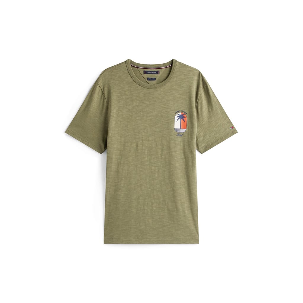 This Tommy Hilfiger top features a regular fit and short sleeves, perfect for casual wear. The crew neck design is complemented by a striking graphic print, adding a touch of style. A subtle logo embellishment completes the look, making it a versatile addition to any wardrobe. -
