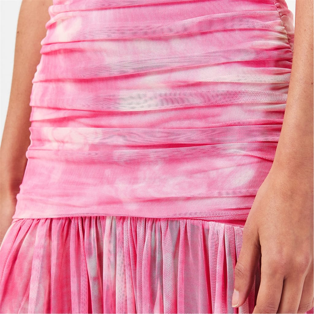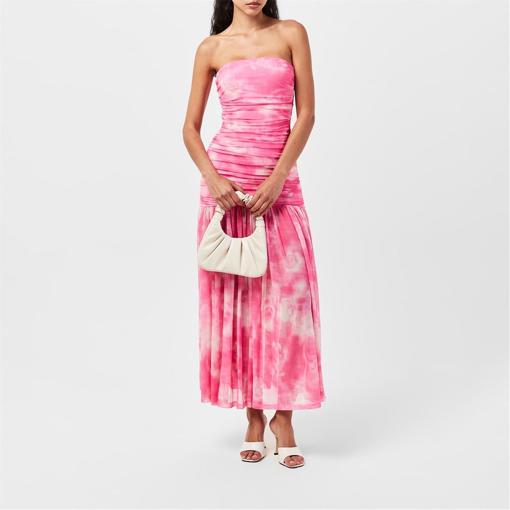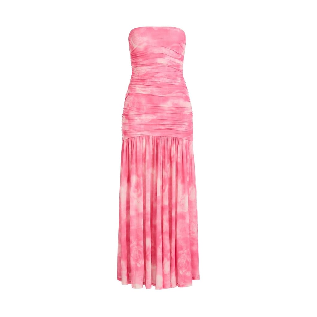 The Solana Mesh Maxi Dress features a strapless mesh design with a fitted bodice, gathered details, a drop waist and fluid hem.