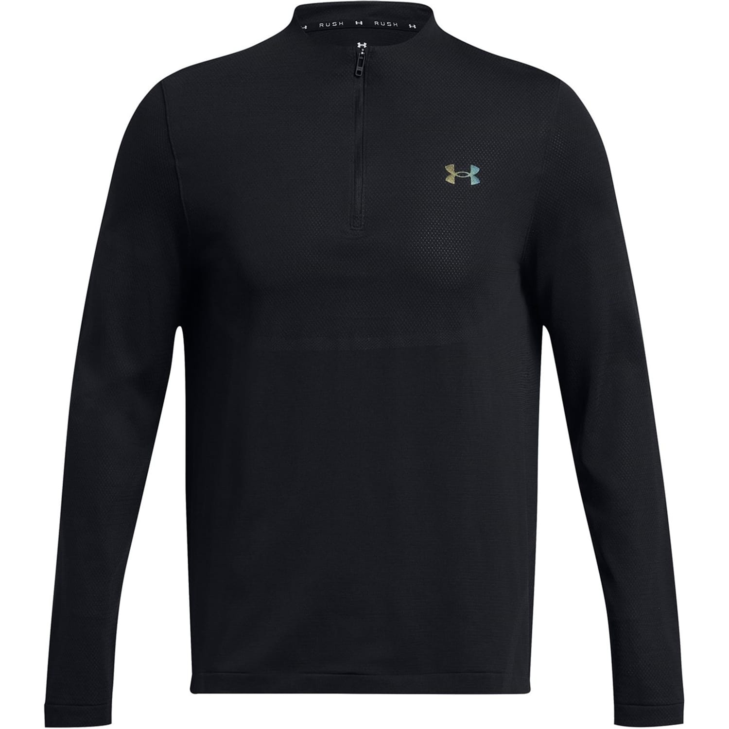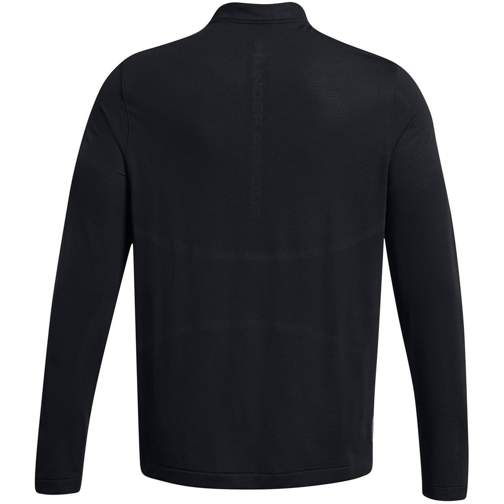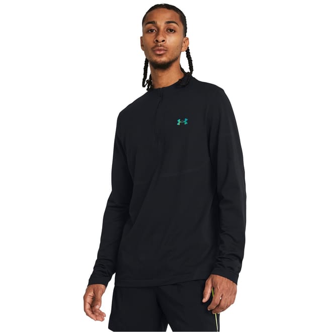 The Under Armour Vanish top is designed for performance, featuring a long sleeve and a mock neck with a zipper closure. This activewear piece offers a regular fit and includes a ribbed cuff for added comfort. The solid pattern is complemented by a subtle logo embellishment, making it a versatile addition to your wardrobe. -
