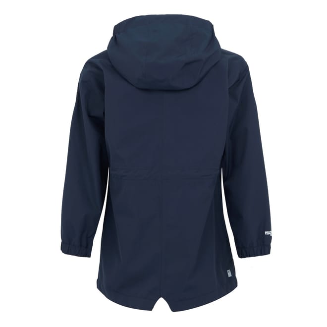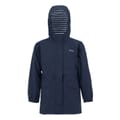 This Regatta rain jacket for juniors combines functionality with style. Featuring a hooded design, it is water-repellent and includes a zipper closure for easy wear. The jacket has a regular fit with an elasticated cuff and a curved hem. Embellished with a logo and pockets, it showcases a stripe pattern, making it a practical choice for rainy days. -