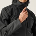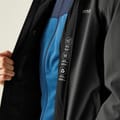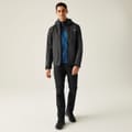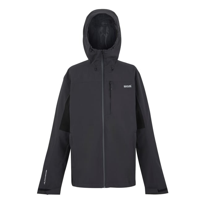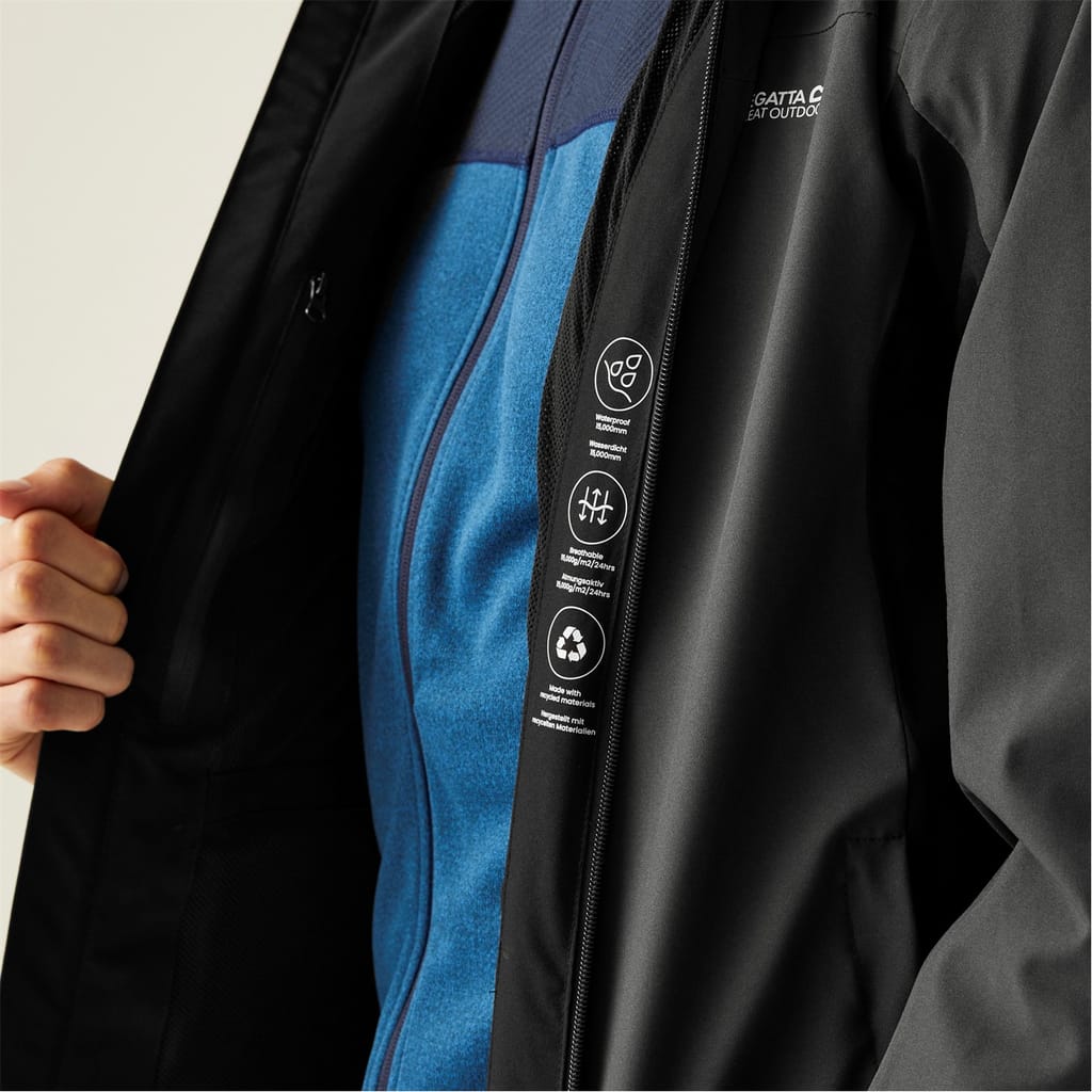 Stay dry with the Regatta rain jacket, featuring a hooded design and water-repellent material. This solid jacket offers a regular fit with a straight hem and elasticated cuffs. It includes a zipper closure with snap buttons for added security. The jacket is adorned with a logo and practical zipped pockets, making it a functional choice for wet weather. -