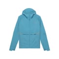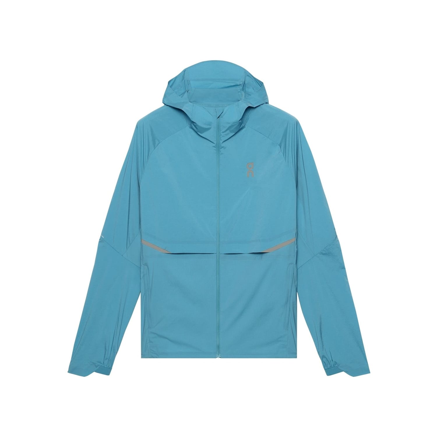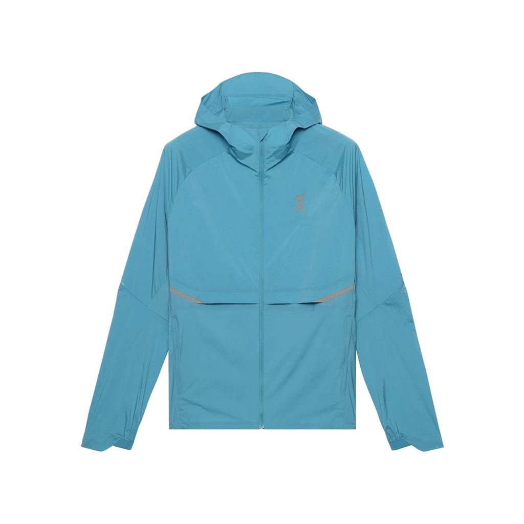 The On running jacket is designed for performance, featuring a hooded neck and a zipper closure. It has a regular fit with a short length, complemented by a straight hem and elasticated cuffs. The solid pattern is enhanced with reflective ribbon and a logo, making it ideal for activewear and sporting activities. -
