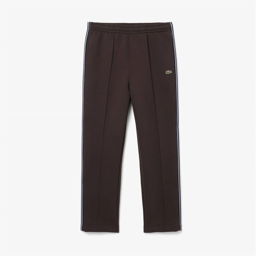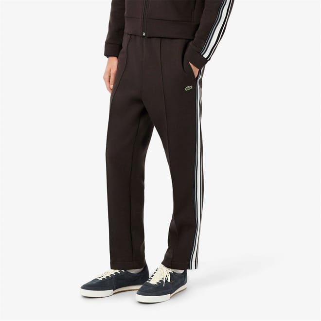 Lacoste track pants offer a regular fit with an elasticated waistband for comfort. Featuring side stripes and a distinctive crocodile logo, these pants are designed for athletic activities. Practical pockets, including side and front pockets, add functionality, while the iconic crocodile print enhances the sporty look. -