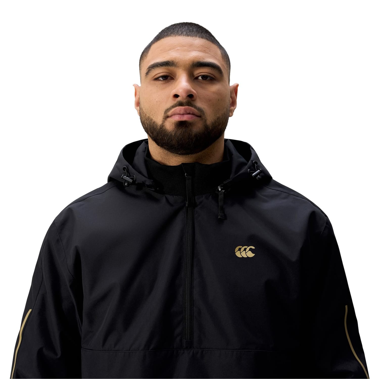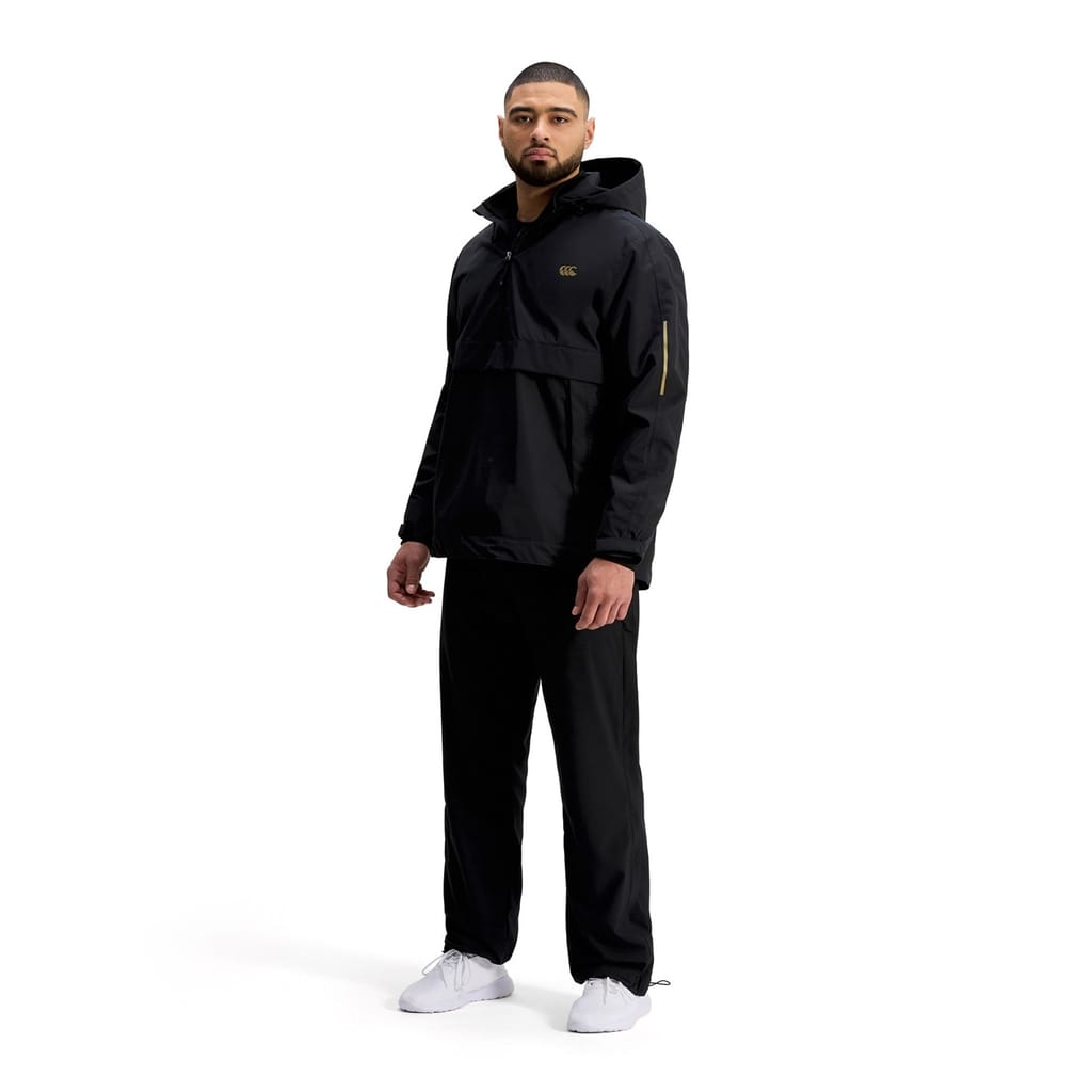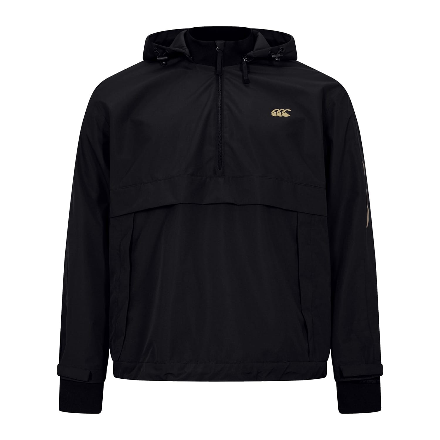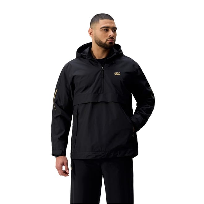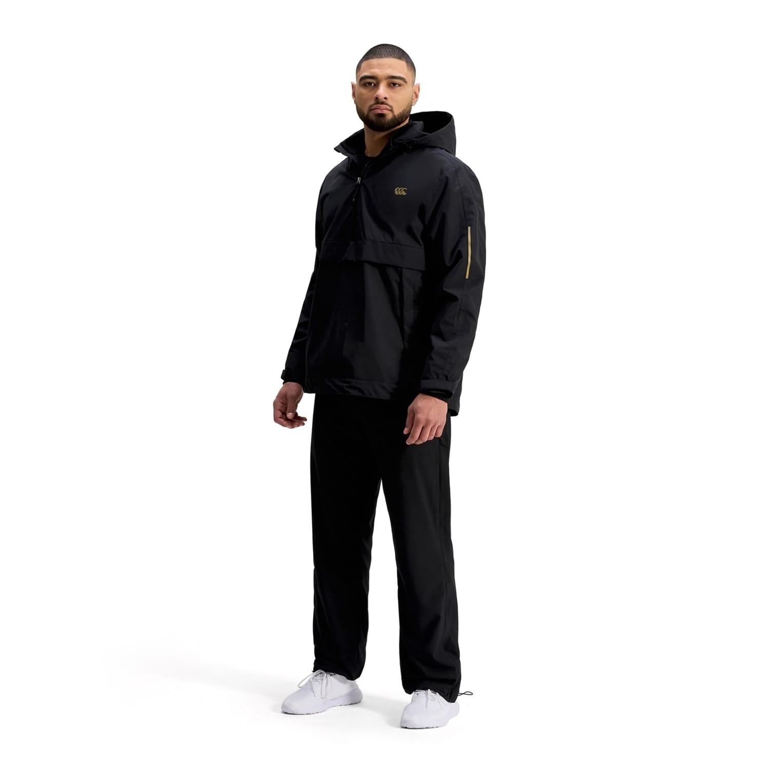 The Canterbury anorak jacket is designed for performance with a relaxed fit and solid pattern. It features a hooded neckline and a straight hem, providing both style and functionality. The jacket includes a zipper closure and elasticated cuffs for added comfort. The logo embellishment adds a touch of brand identity to this versatile piece. -