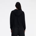 The New Balance sweatshirt jacket features a hooded neckline and a relaxed fit, crafted from French terry fabric. It includes a front zipper closure and ribbed cuffs for added comfort. The solid pattern and straight hemline offer a clean look, while the logo embellishment adds a touch of brand identity. Perfect for casual collections. -
