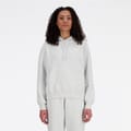This New Balance terry top is crafted from French terry fabric, offering a relaxed fit for all-season comfort. Featuring a hooded neck and long sleeves with ribbed cuffs, it is designed for casual wear. The solid pattern is complemented by a subtle logo embellishment, adding a touch of brand identity. -