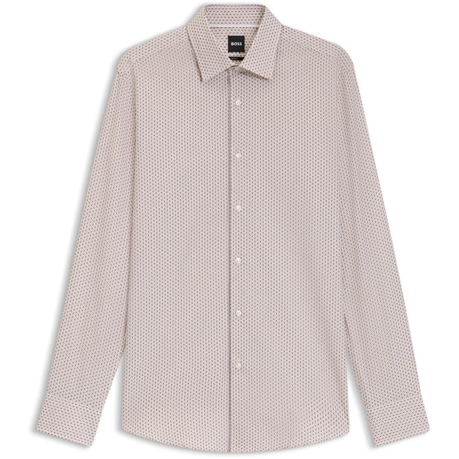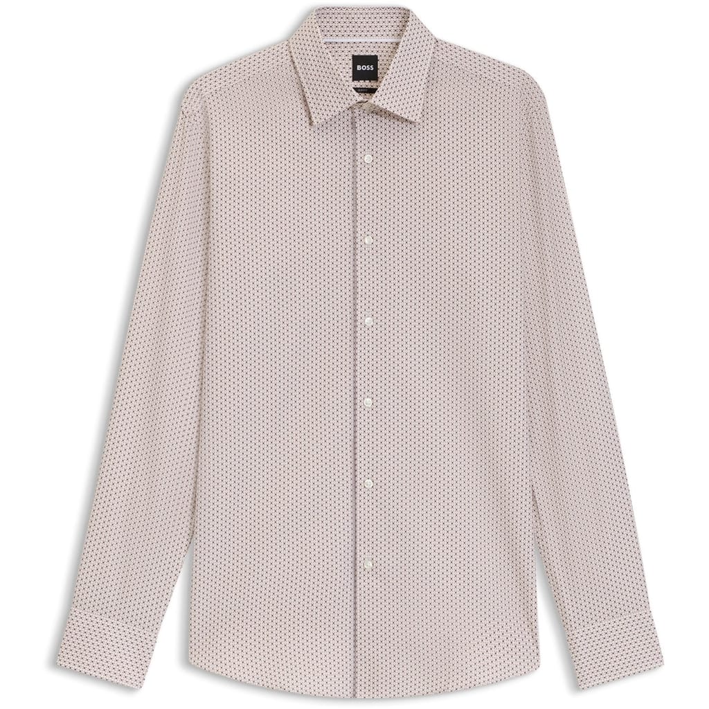 This Boss top features a geometric pattern and is crafted with long sleeves and a regular fit. It includes a button closure and a point collar, complemented by barrel cuffs. The design is enhanced with a logo embellishment, adding a distinctive touch to the patterned style. -