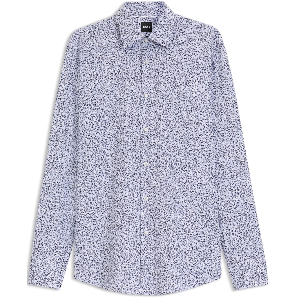 The BOSS Menswear Floral Print Stretch Cotton Poplin Shirt features a modern slim fit with a bold, all-over floral print, bringing fresh style to any wardrobe. Made from soft poplin and stretch cotton, it ensures comfort and flexibility. Versatile enough for both work and casual wear, it's perfect for a smart-casual office look or a laid-back dinner with friends.