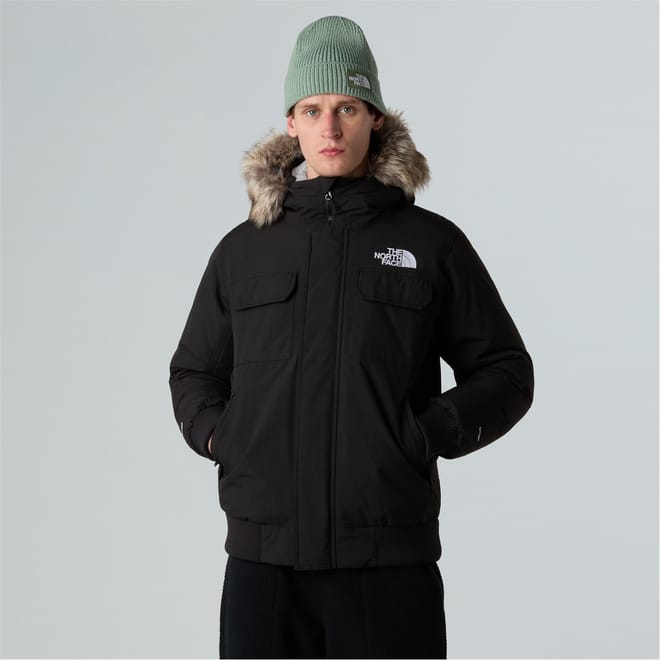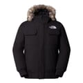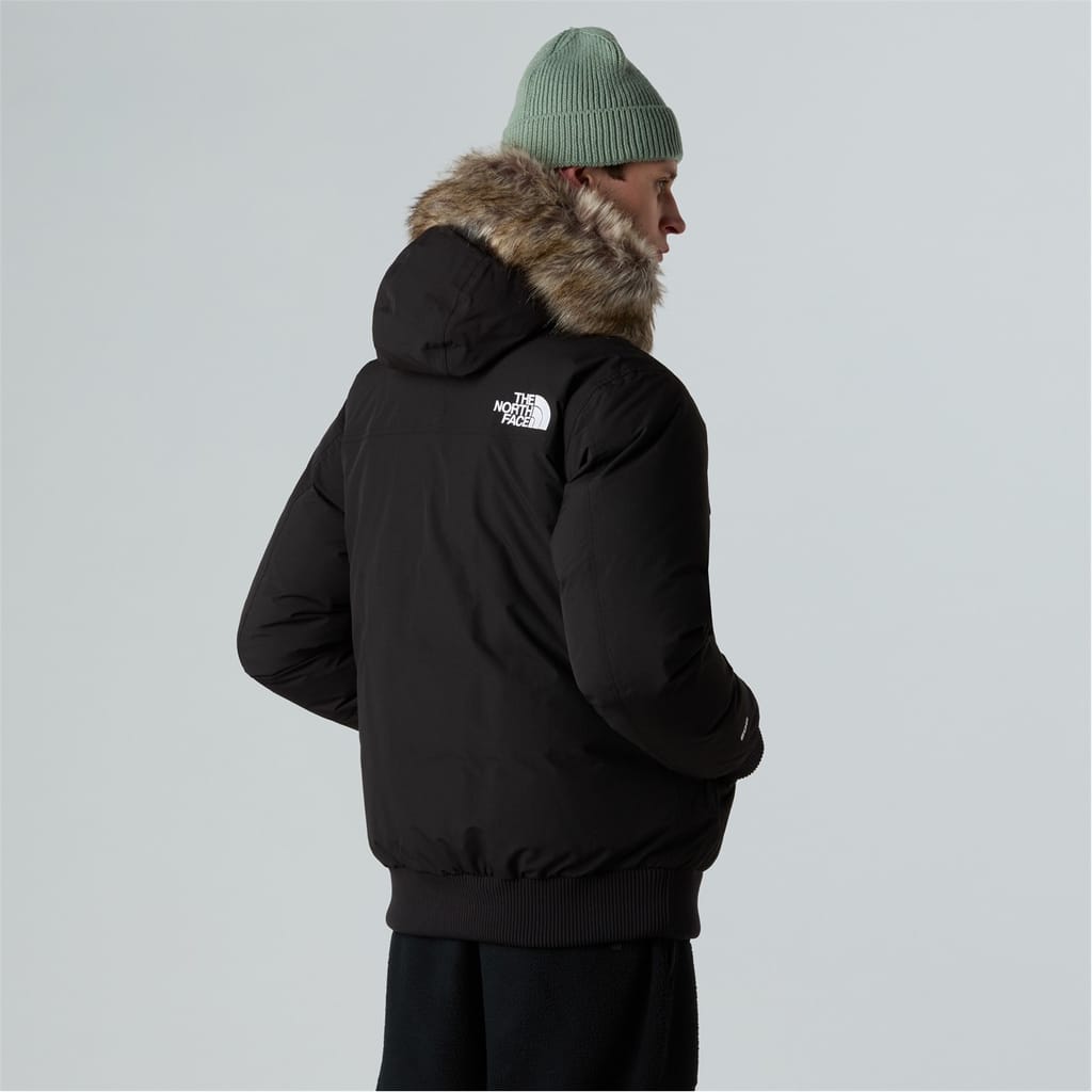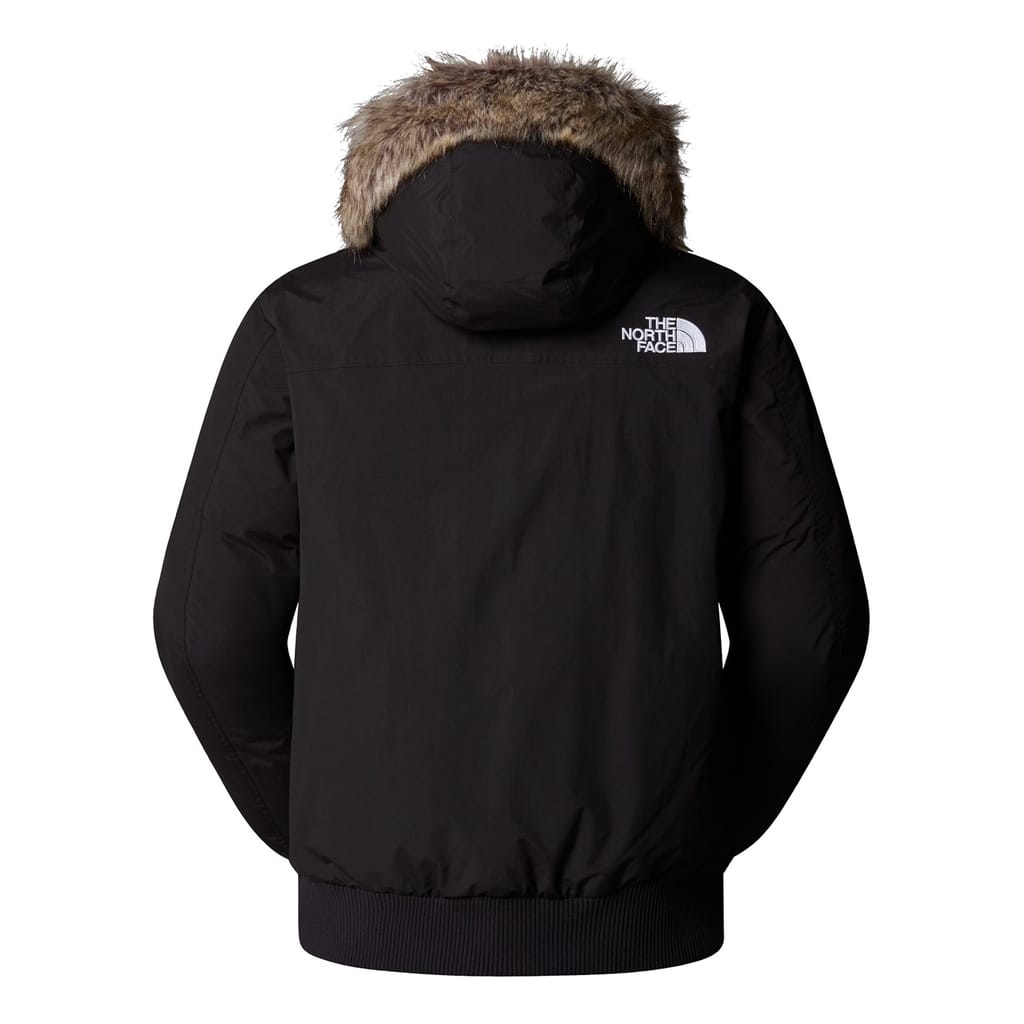 The North Face bomber jacket is designed for winter, offering a short length and regular fit. It features a hooded neckline and a solid pattern, complemented by a ribbed cuff and hem. The jacket includes a zipper closure and practical pockets, making it a versatile choice for both sport and casual collections. -