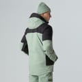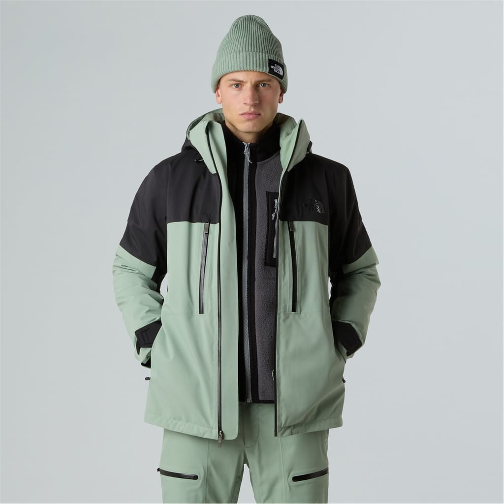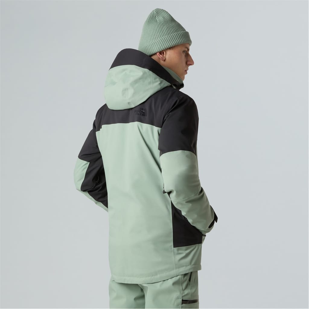 The North Face ski jacket features a hooded neck and a zipper closure, offering a regular fit. Its design includes a straight hem and a colour block pattern, complemented by a logo embellishment. This jacket is crafted for functionality and style, making it a reliable choice for outdoor adventures. -