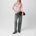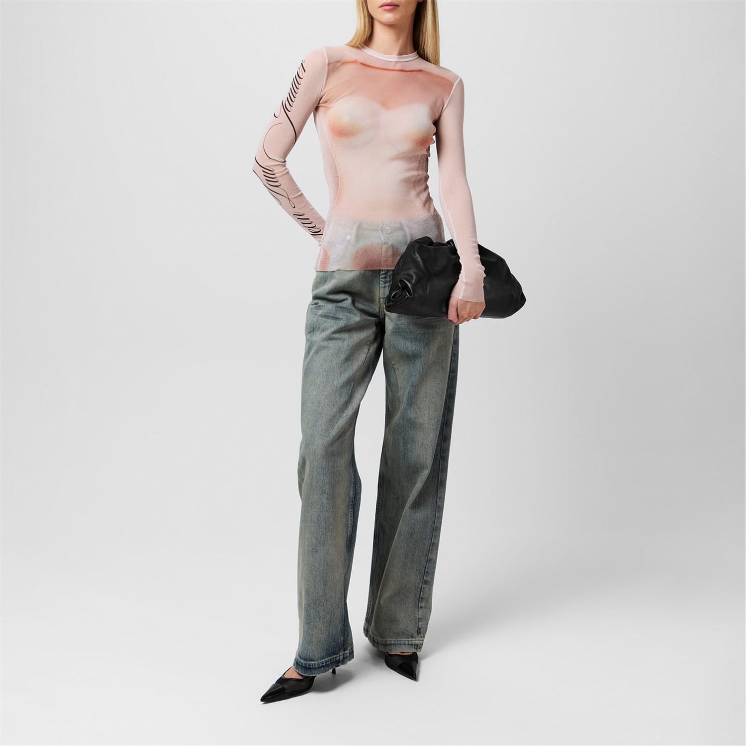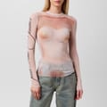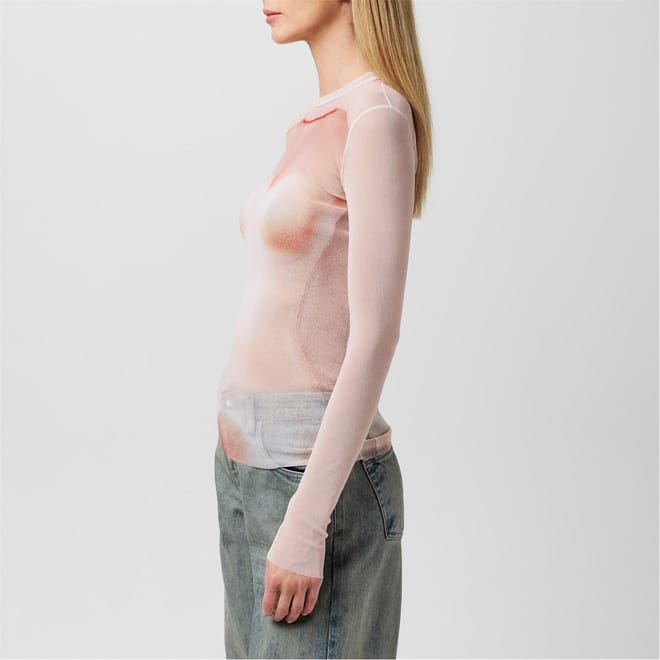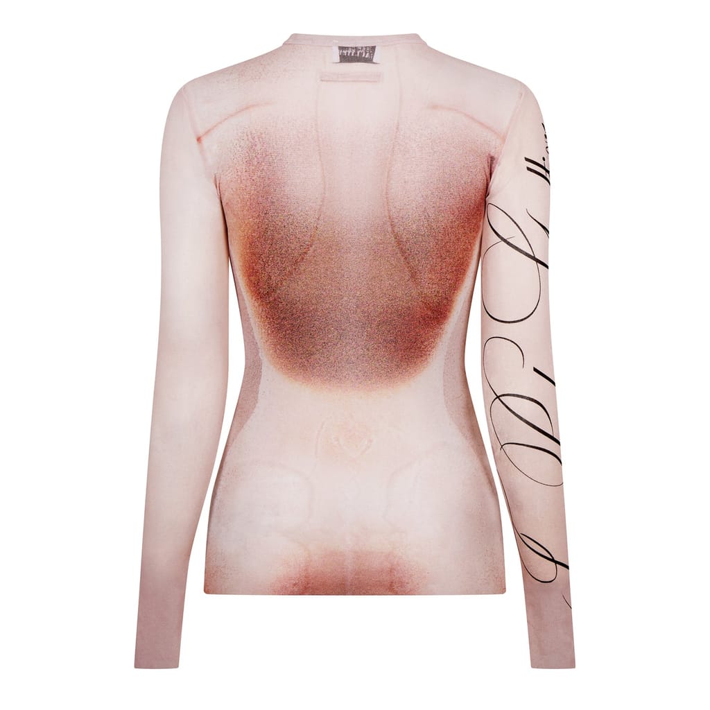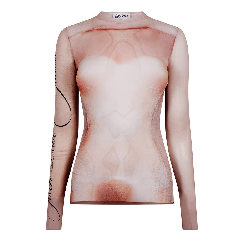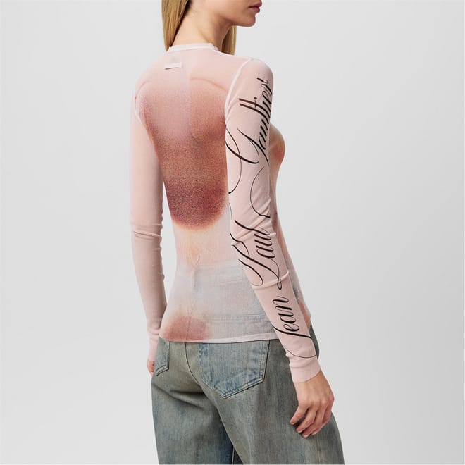 This Jean Paul Gaultier top features a slim fit with long sleeves and a crew neck. The design is enhanced by mesh details and a striking graphic print. A subtle logo embellishment adds a touch of brand identity to this stylish piece. -