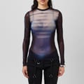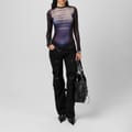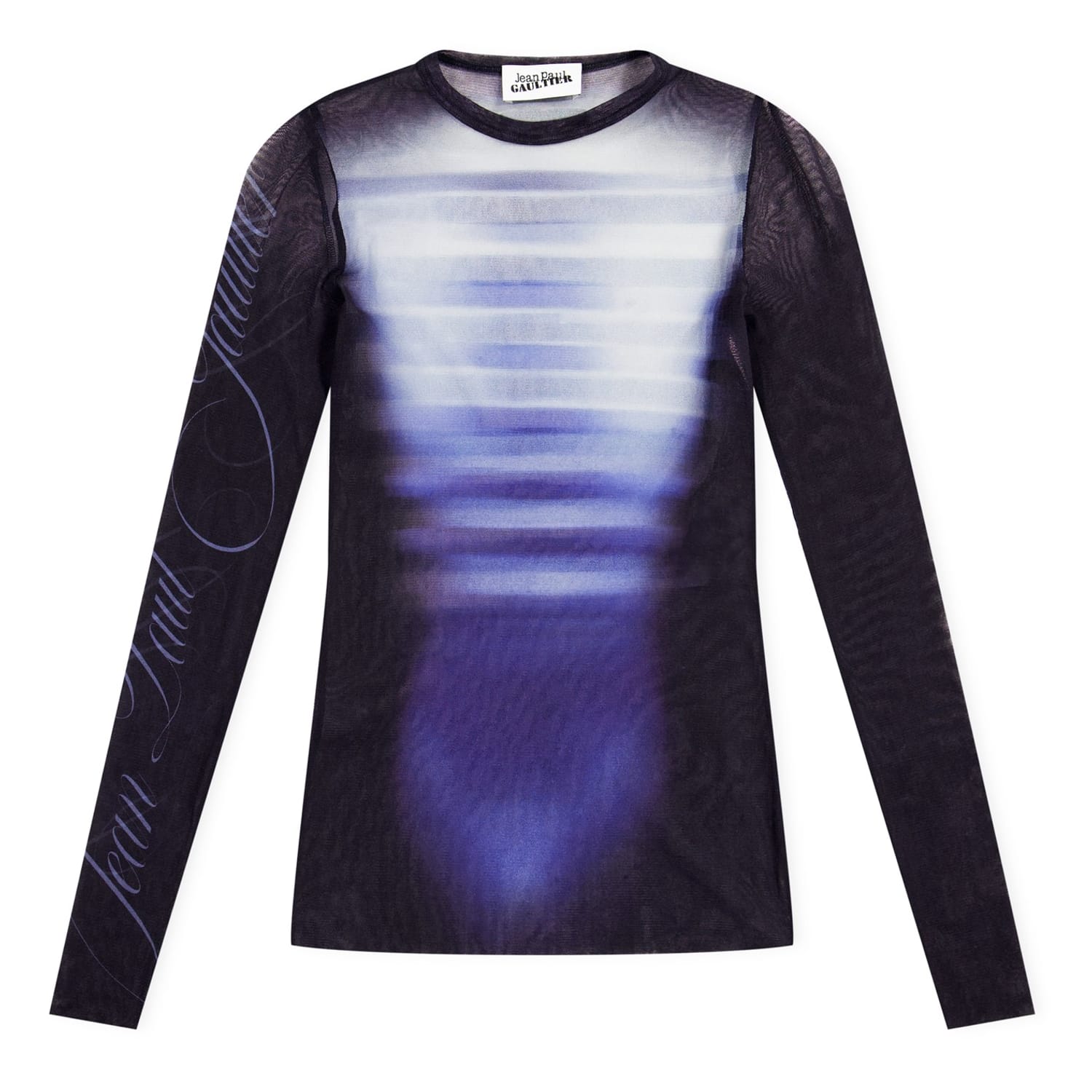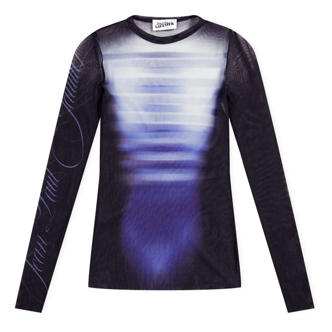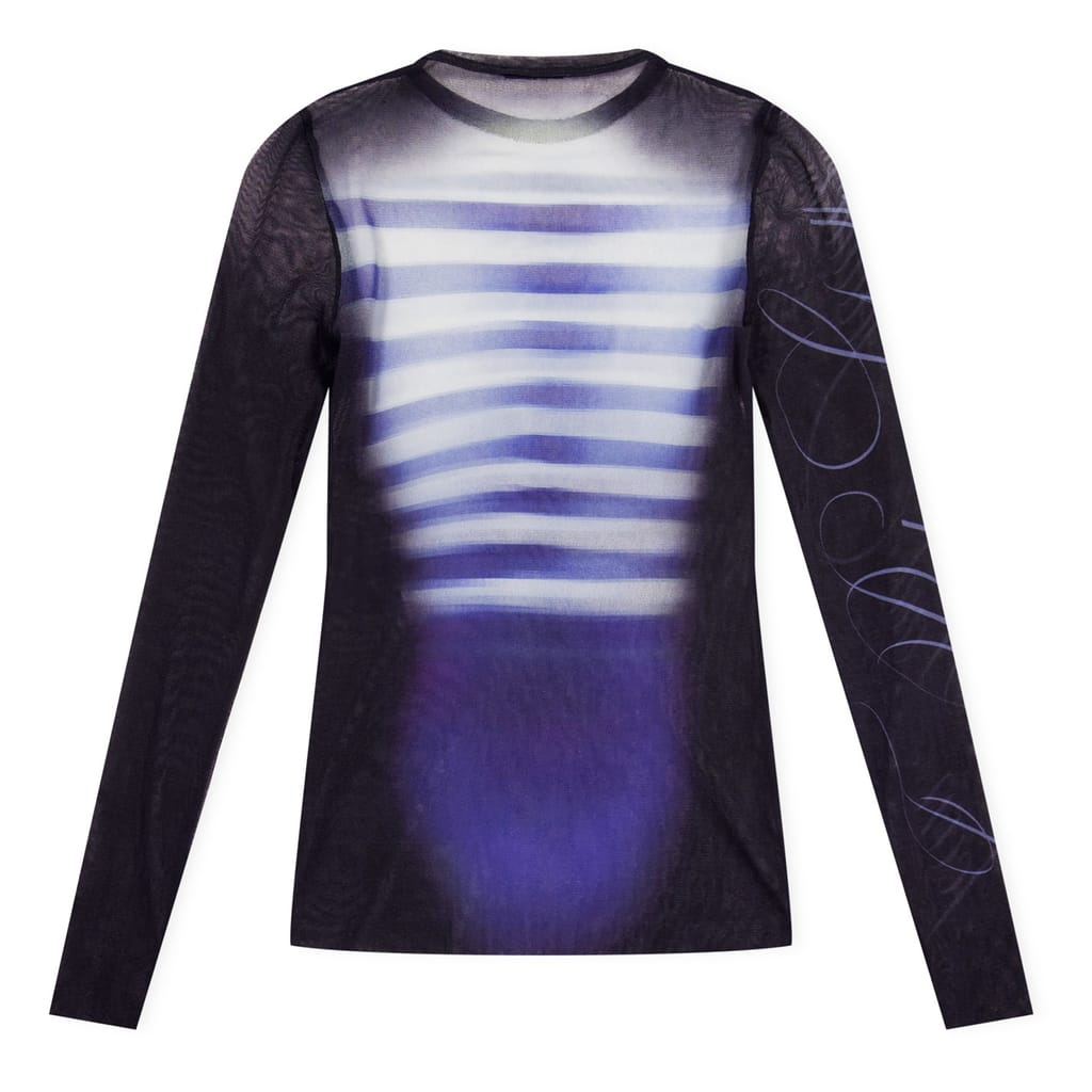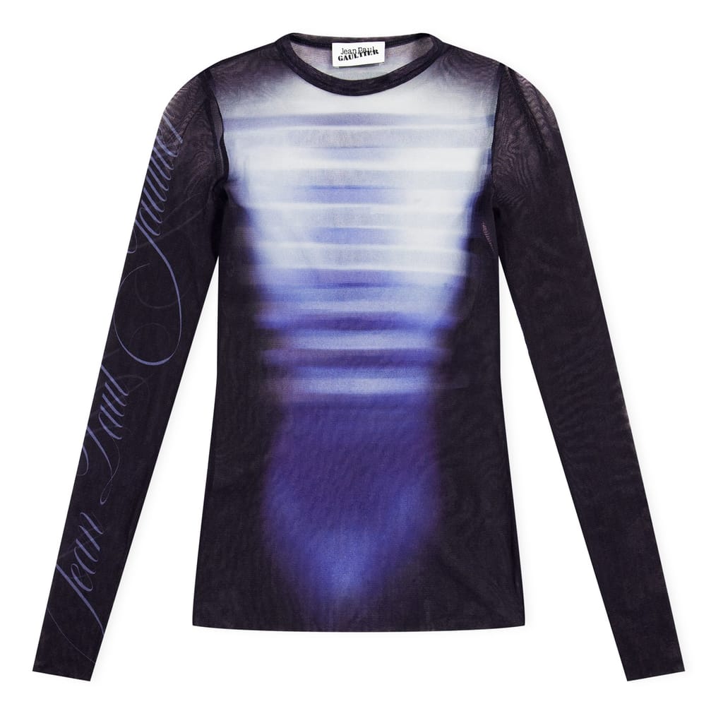This Jean Paul Gaultier top features a striking stripe pattern and a crew neck design. Crafted in a slim fit, it offers a sleek silhouette. The long sleeves add a touch of elegance, while the logo embellishment provides a subtle brand statement. -