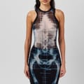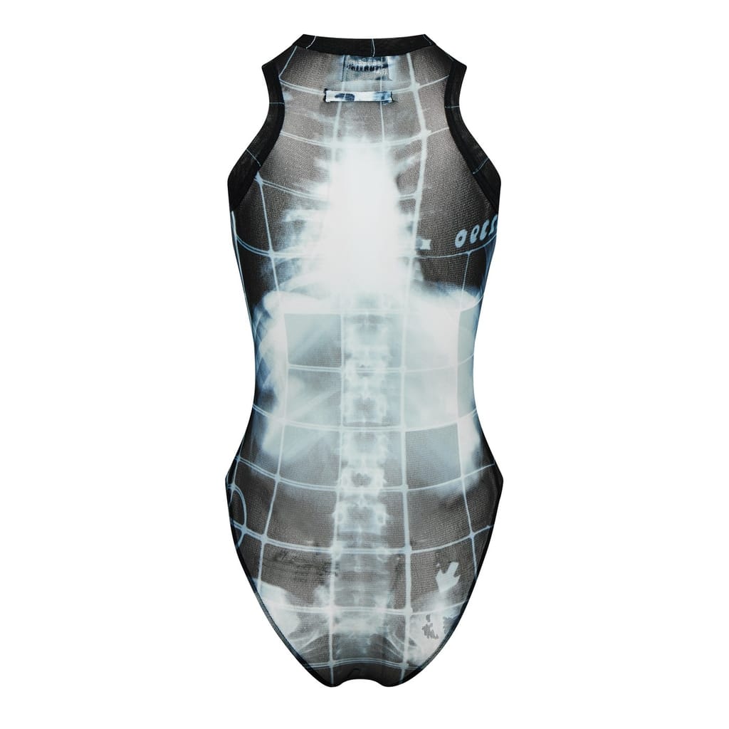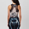 This Jean Paul Gaultier top features a striking graphic print and mesh details, offering a unique style. The sleeveless design and crew neck provide a modern look, while the slim fit ensures a flattering silhouette. A subtle logo embellishment adds a touch of brand identity to this distinctive piece. -