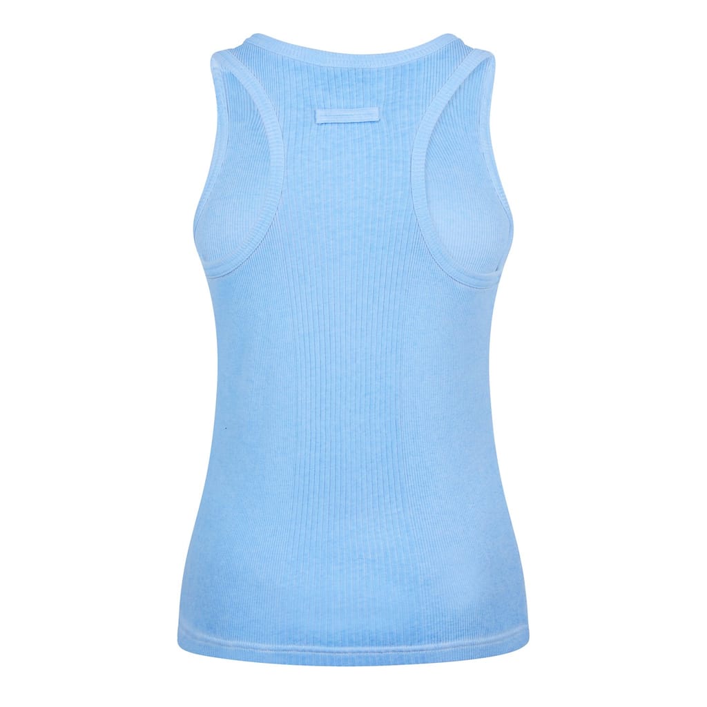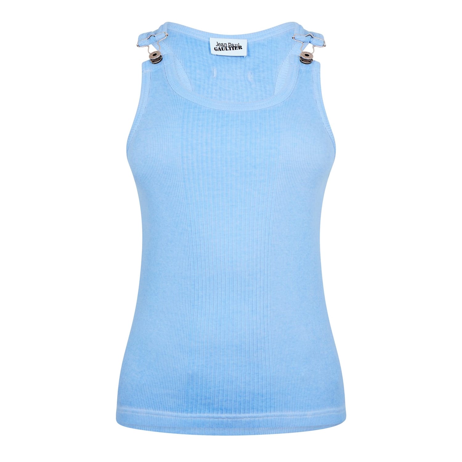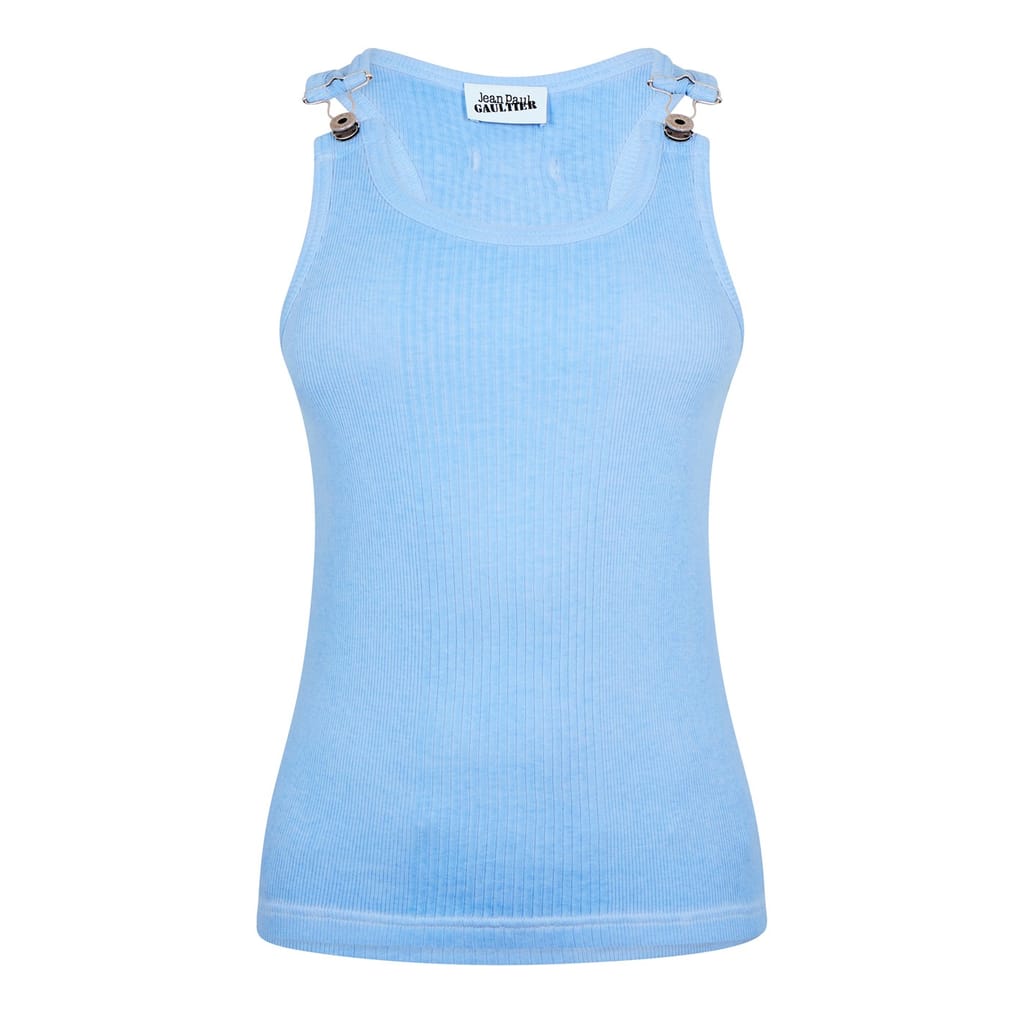 This Jean Paul Gaultier top features a sleeveless design with spaghetti straps and a scoop neck. Crafted in a ribbed pattern, it offers a slim fit for a sleek silhouette. -