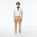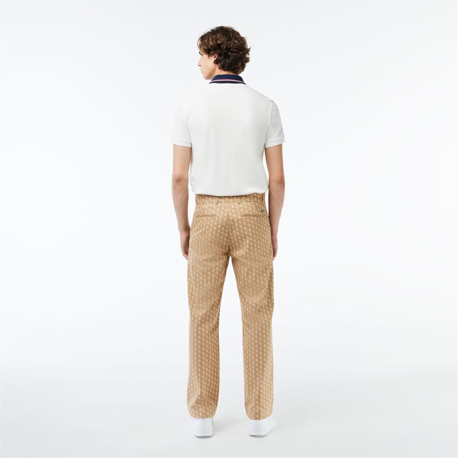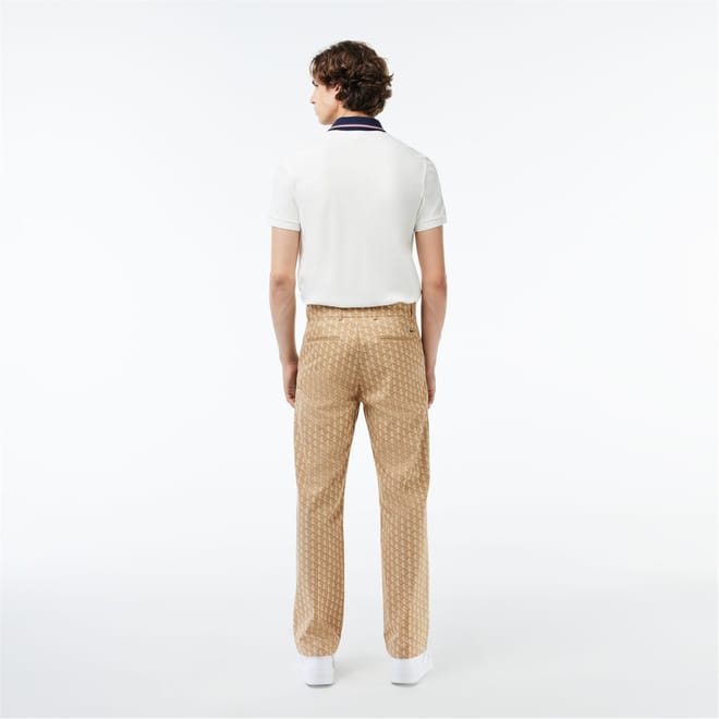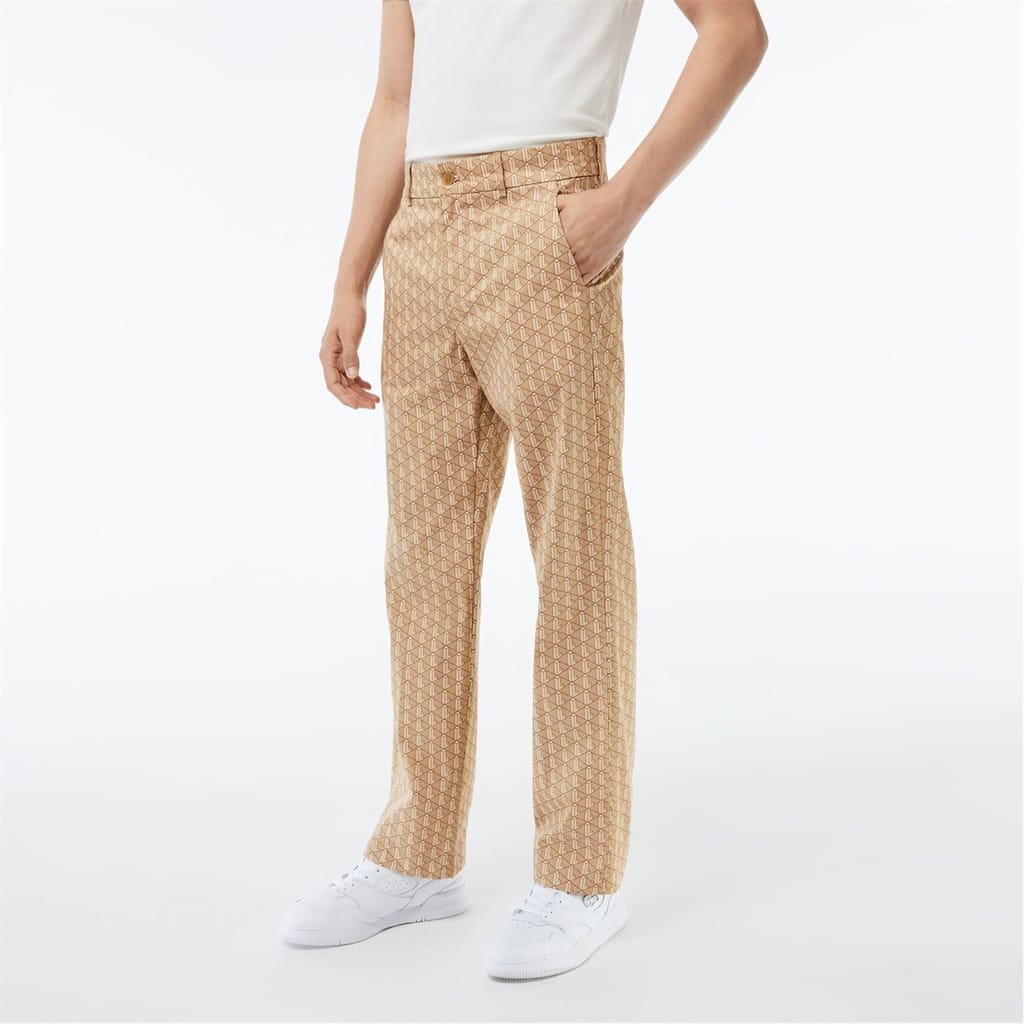 Lacoste chinos feature a geometric pattern and a regular fit, offering a stylish yet comfortable option for casual wear. The design includes a zip fly and button closure, ensuring a secure fit. A subtle logo embellishment adds a touch of brand identity to these versatile pants. -