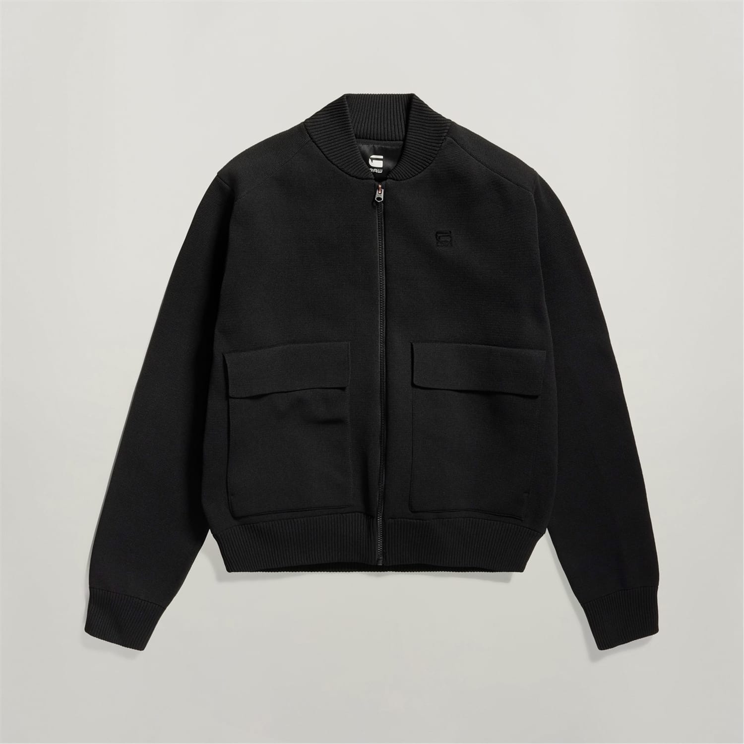 This G-Star top is a casual knit piece featuring a bomber collar and long sleeves. It has a regular fit with a ribbed cuff and a solid pattern. The top is designed with a zipper closure and includes a logo and pocket embellishment for added style. -