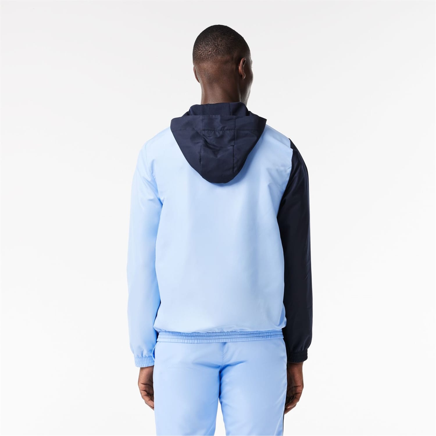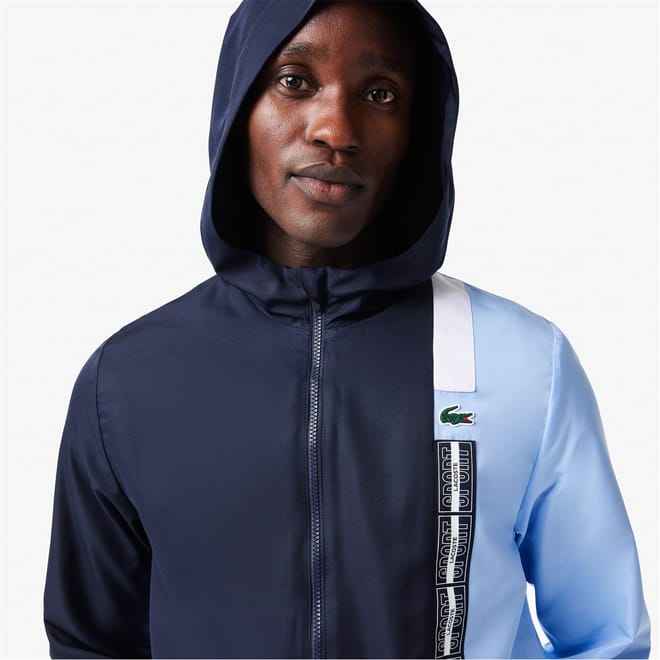 Stay dry and stylish with Lacoste's rain jacket. This water-repellent jacket features a regular fit and a color block pattern. Its design includes a practical zipper closure, a straight hem, and ribbed cuffs. The iconic Lacoste logo adds a touch of brand recognition, making it a functional yet fashionable choice for rainy days. -