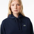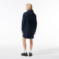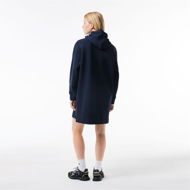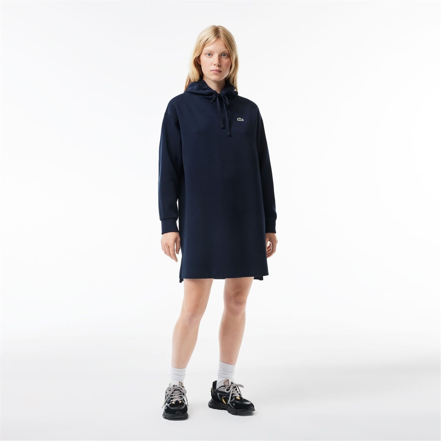 This Lacoste sweatshirt dress combines casual style with a touch of elegance. Featuring a knee-length design, it has a hooded neckline and long sleeves with a drop shoulder style. The solid pattern is complemented by a straight hem and a drawstring closure. The iconic crocodile print logo adds a distinctive touch, making it a standout piece in any wardrobe. -