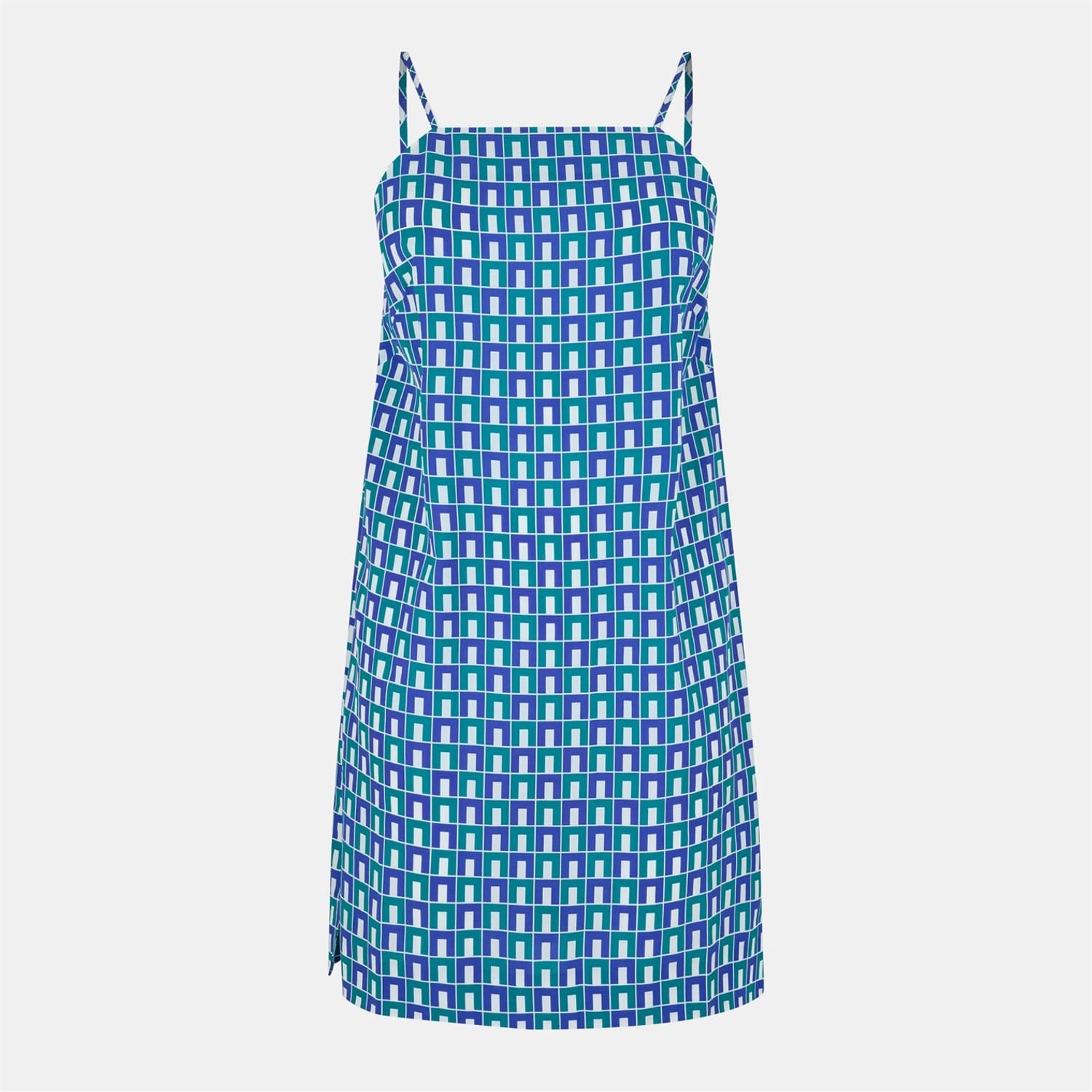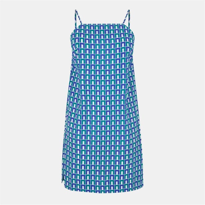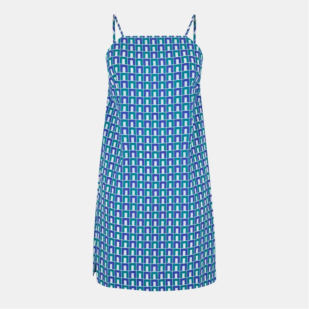 This Lacoste mini dress features a geometric pattern and a sleek slip style. Designed with a spaghetti strap neckline and a straight hem, it offers a modern and stylish look. -