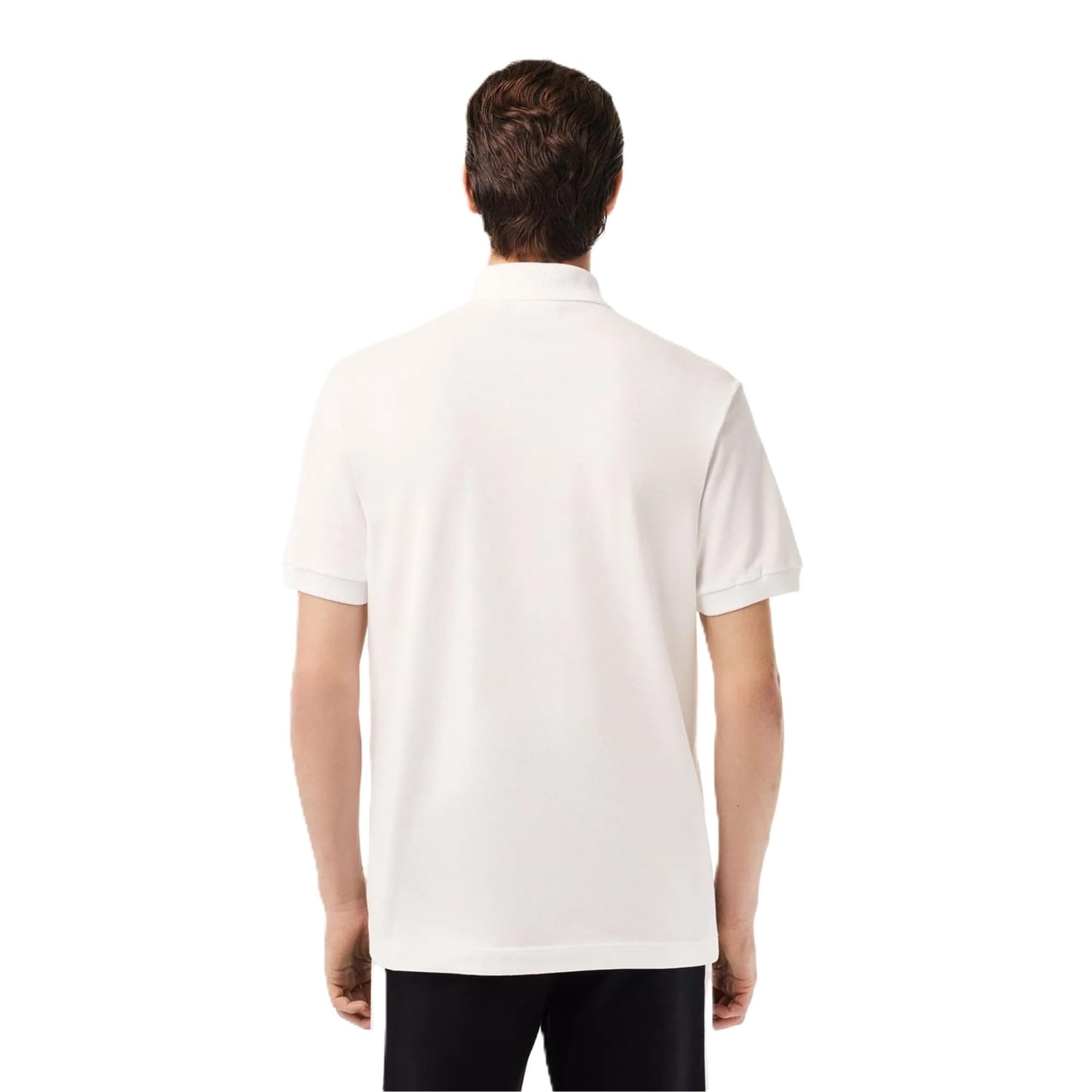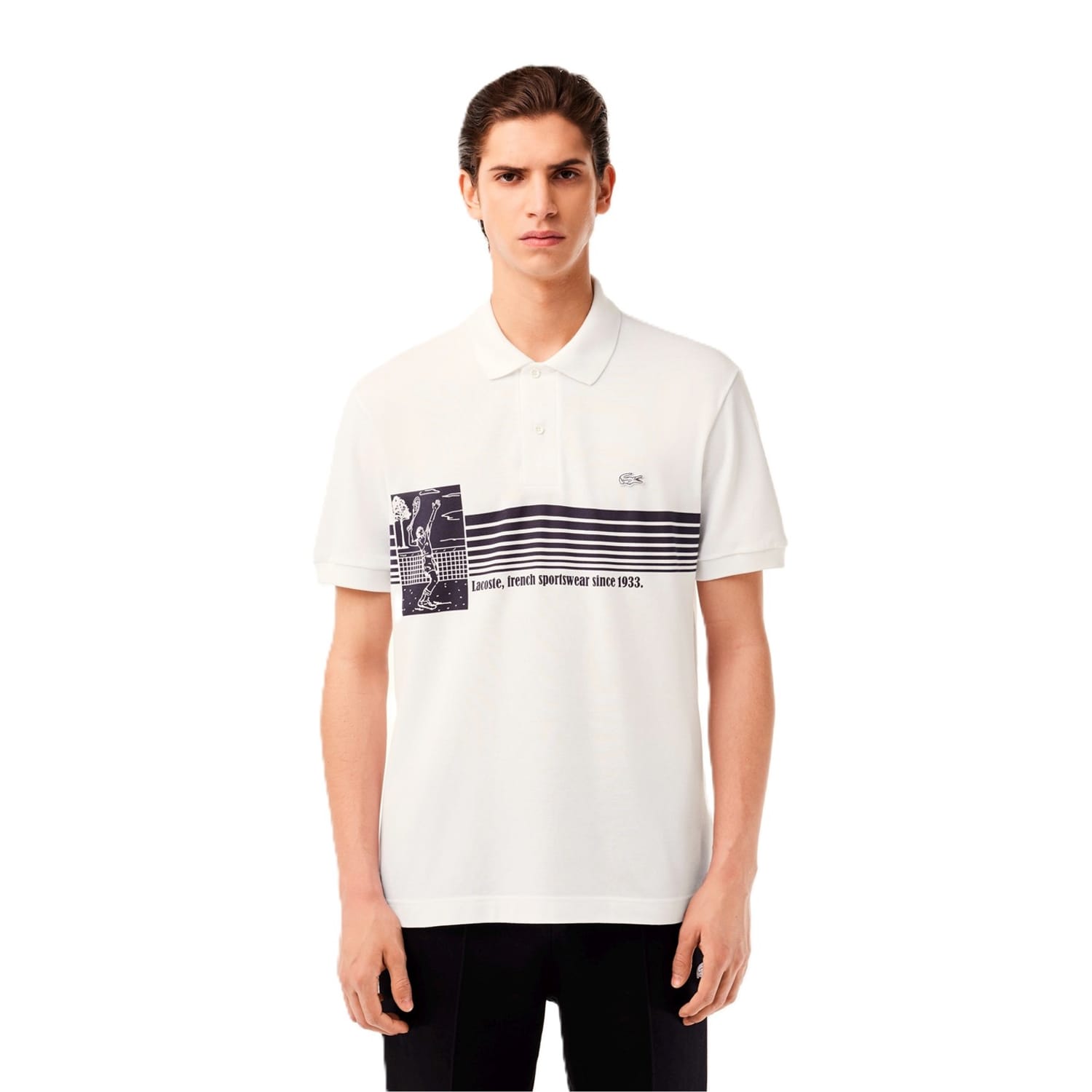 This Lacoste top from the semi-formal collection features a polo collar and short sleeves. It has a button closure and a regular fit, adorned with a graphic print and the iconic logo. -