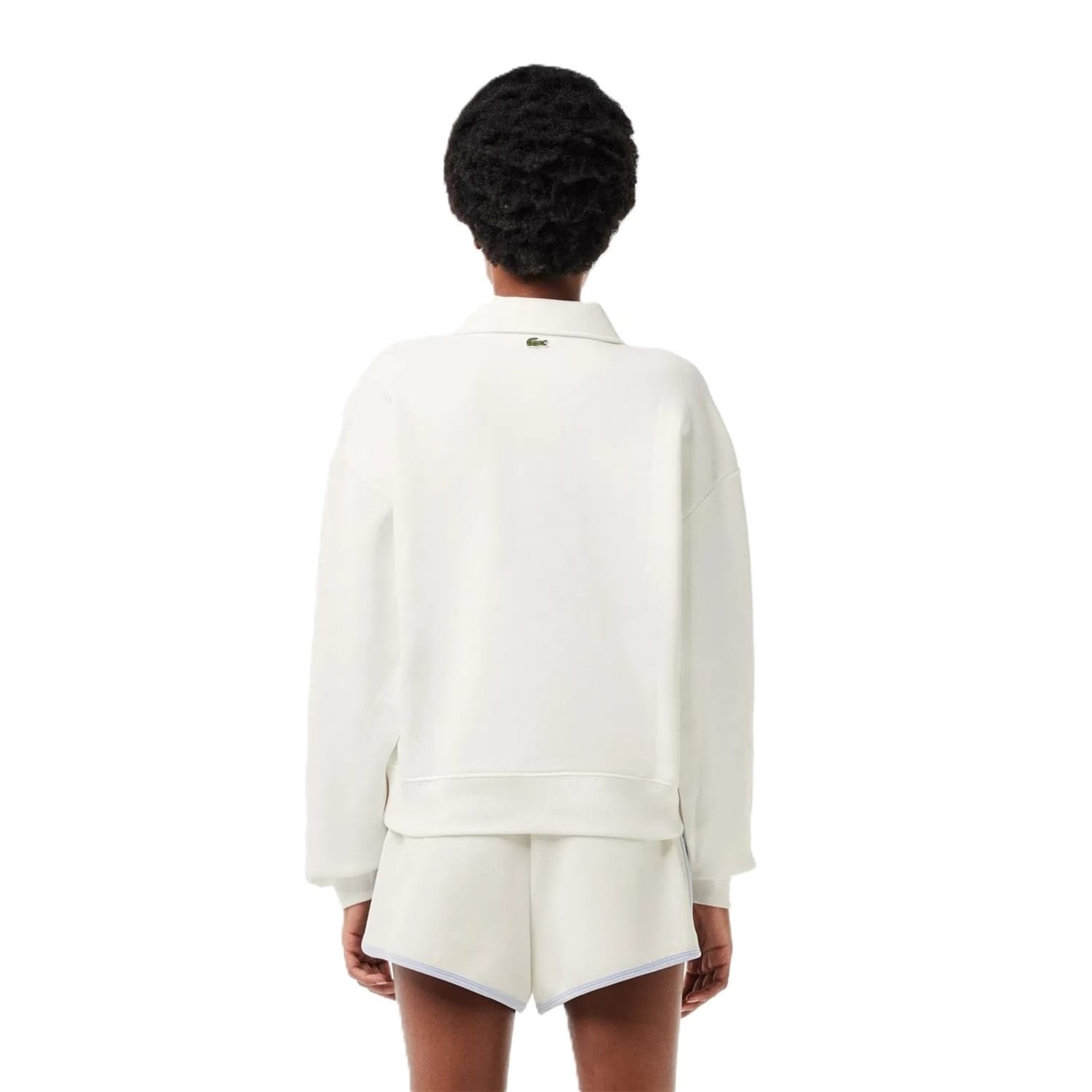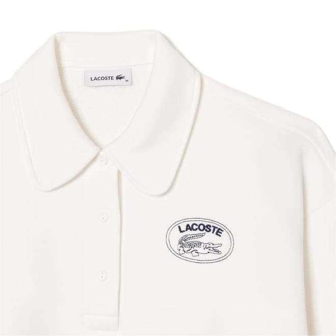 This Lacoste top features a relaxed fit with long sleeves and a drop shoulder design. The polo collar adds a classic touch, while the ribbed cuffs ensure a comfortable fit. The solid pattern is complemented by an embroidered logo, offering a subtle yet stylish embellishment. -