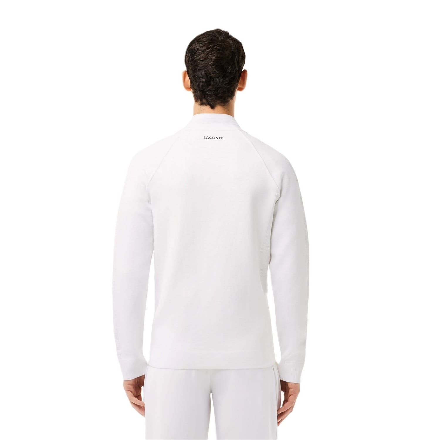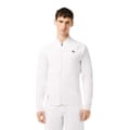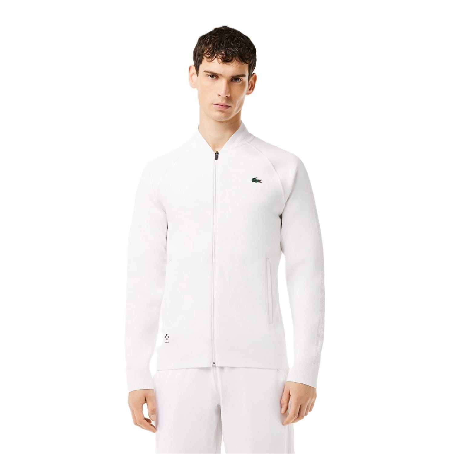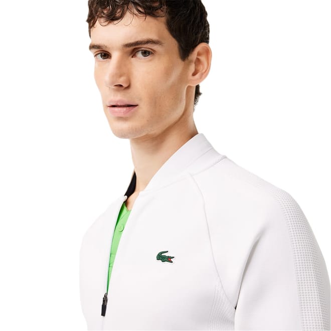This Lacoste track jacket from the activewear collection features a mock neck and bomber collar, offering a sleek and sporty look. The jacket is designed with a zipper closure and snap buttons for added convenience. It has a regular fit with a ribbed top cuff and a straight hem. The solid pattern is complemented by a subtle logo embellishment, making it a versatile addition to your wardrobe. -