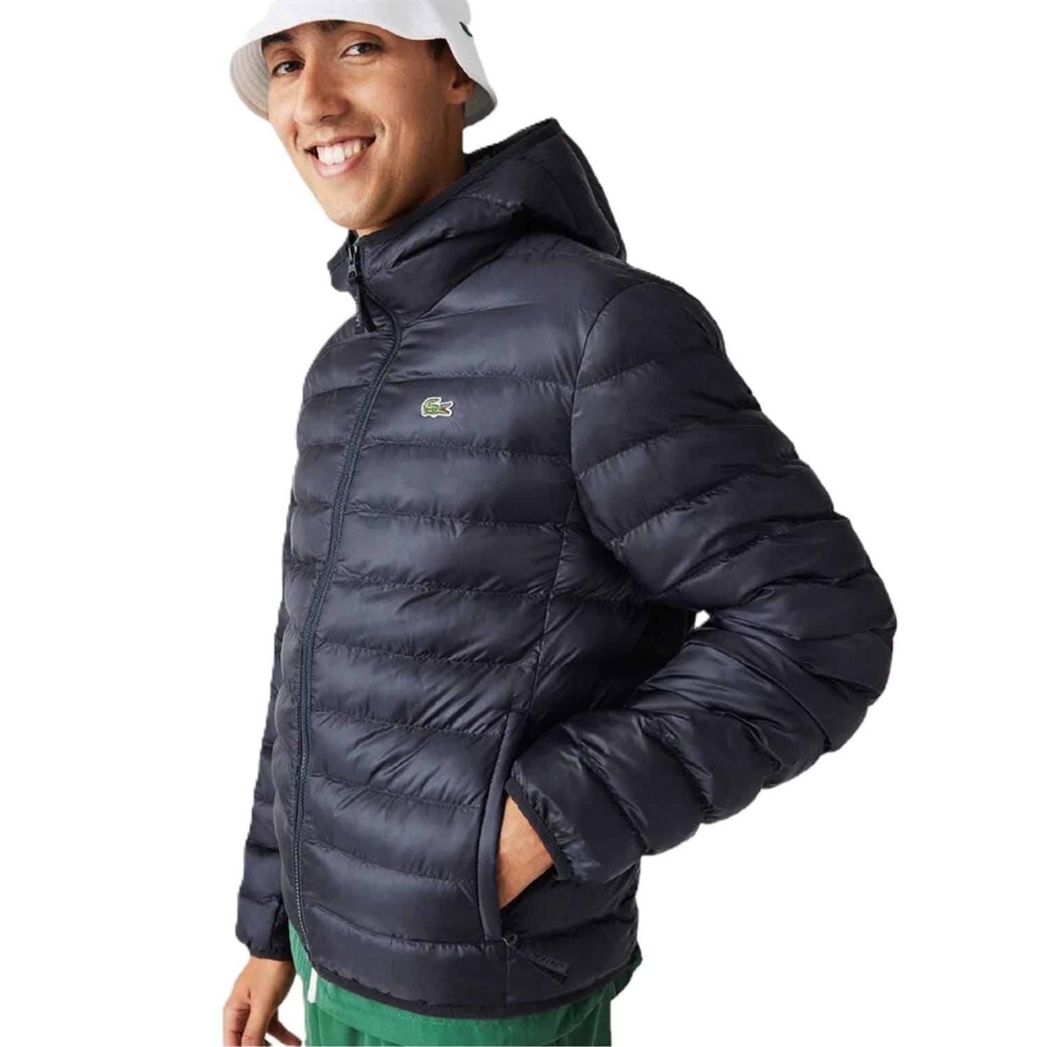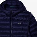 This Lacoste puffer jacket is designed with a quilted, short silhouette and features a hooded neckline. The solid pattern and regular fit offer a classic look, while the zipper closure ensures practicality. Embellished with the iconic logo, this jacket combines style and functionality for a versatile addition to your wardrobe. -