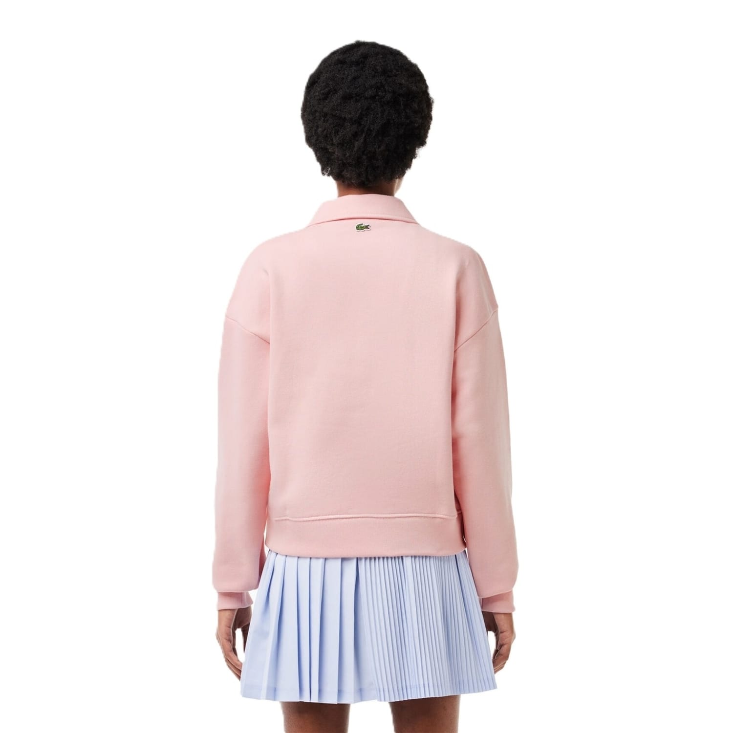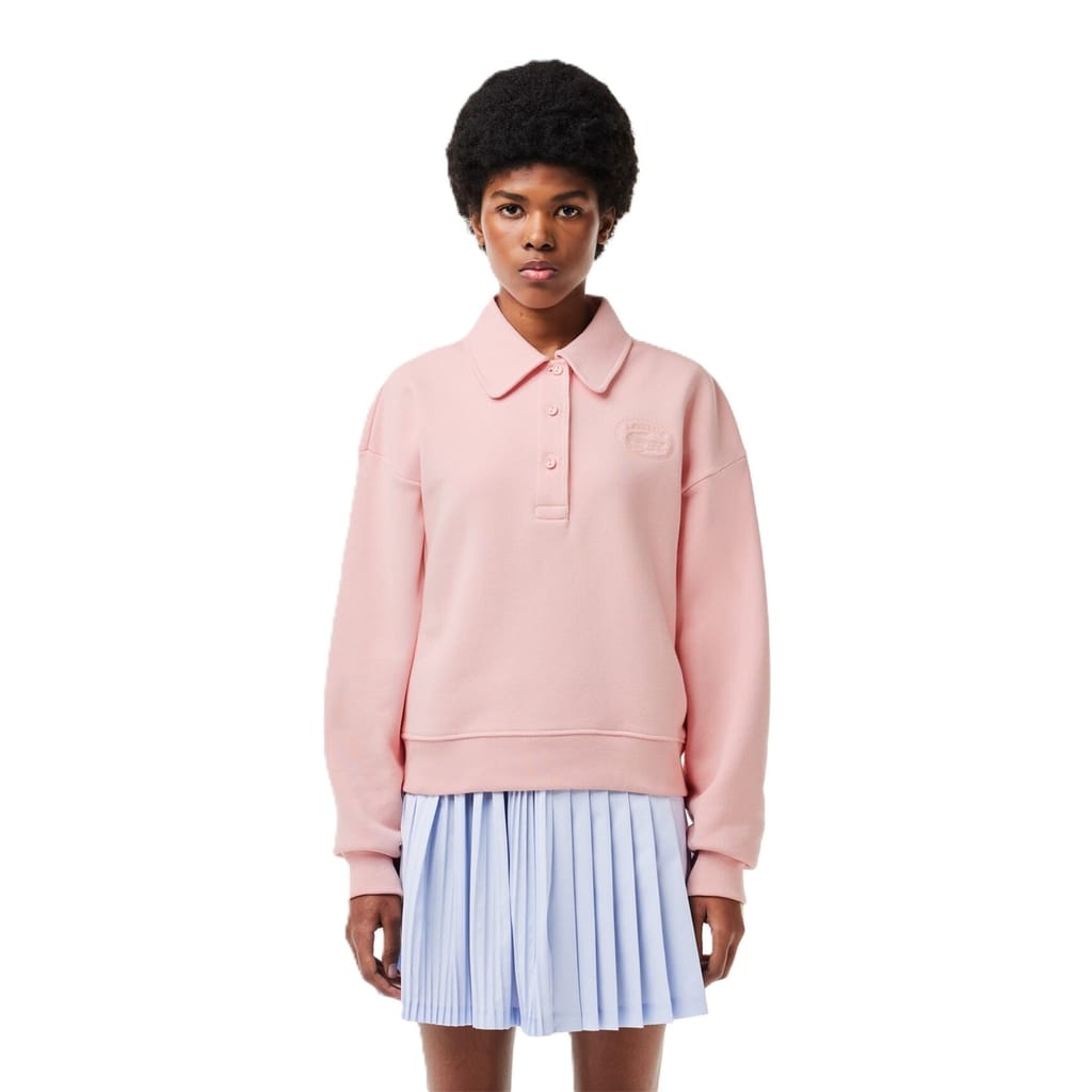 This Lacoste top features a relaxed fit with long sleeves and a drop shoulder design. The polo collar adds a classic touch, while the ribbed cuffs ensure a comfortable fit. The solid pattern is complemented by a subtle logo embellishment, offering a refined look. The top is secured with a button closure, making it a versatile addition to your wardrobe. -