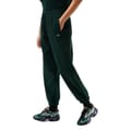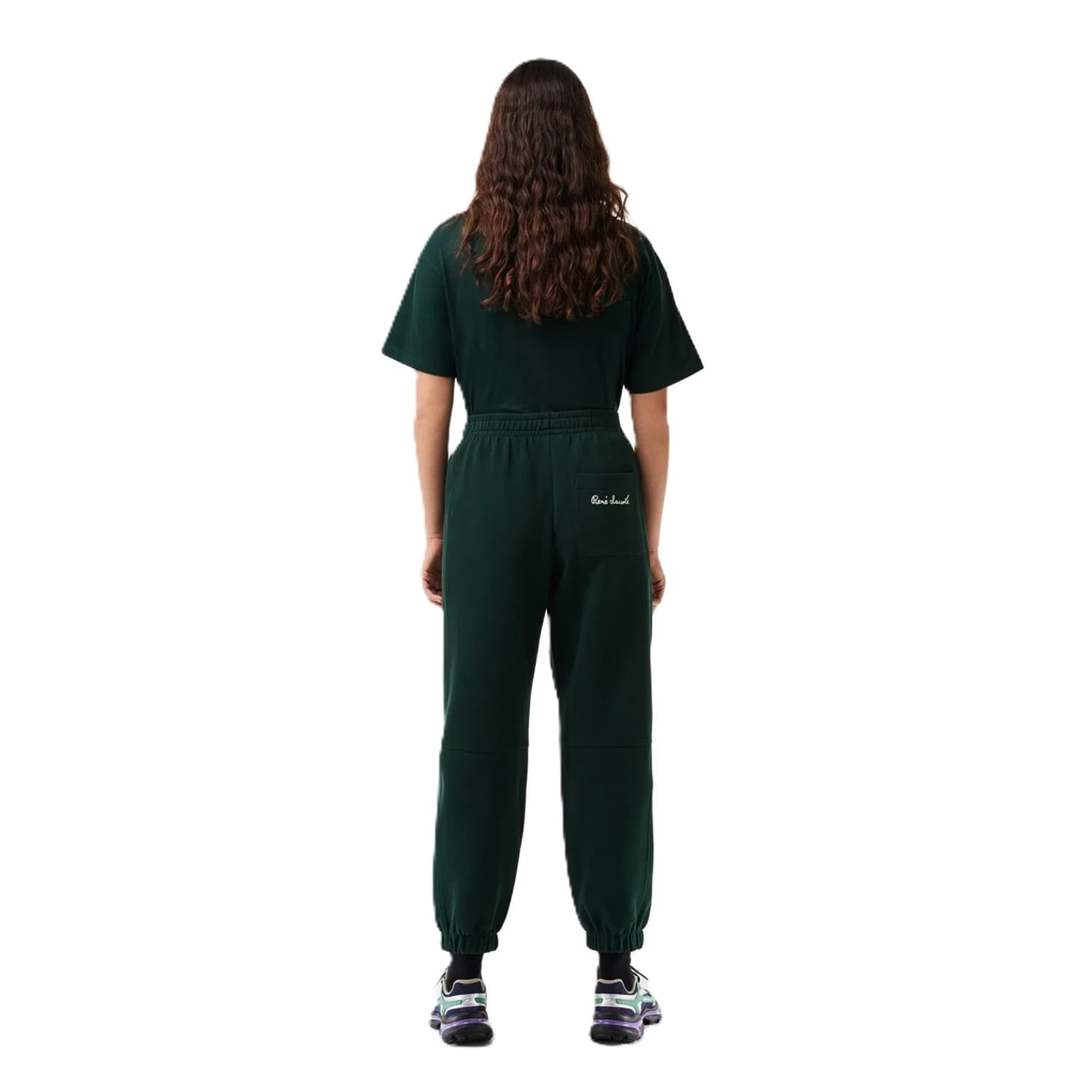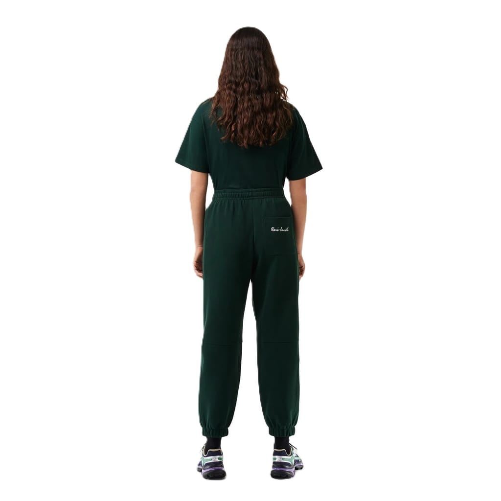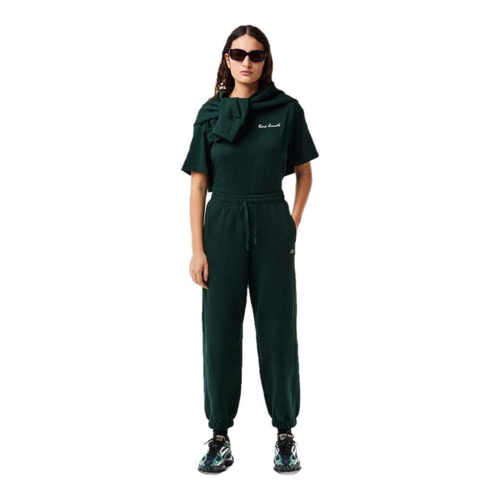 Lacoste joggers feature a drawstring closure and a cuffed leg design. These joggers are adorned with a logo and include side pockets for added convenience. -