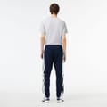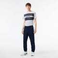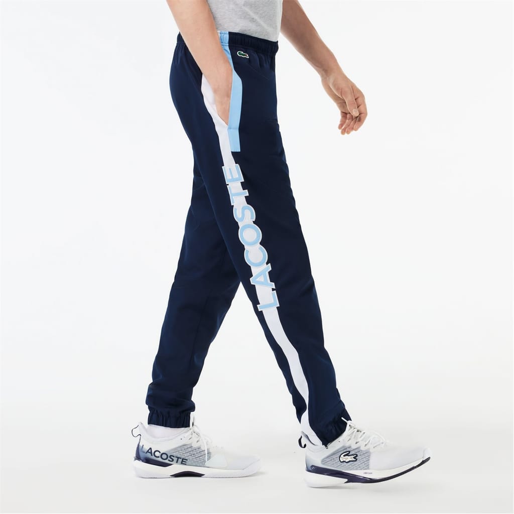 Lacoste running pants from the activewear collection feature a color block pattern and a vertical logo embellishment. Designed with a drawstring closure, these athletic pants are perfect for sporting activities. -