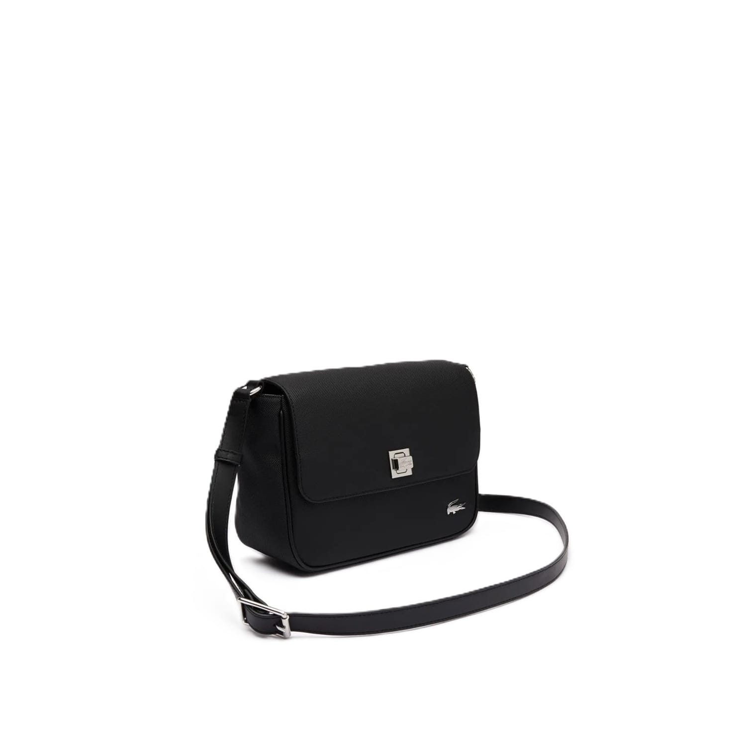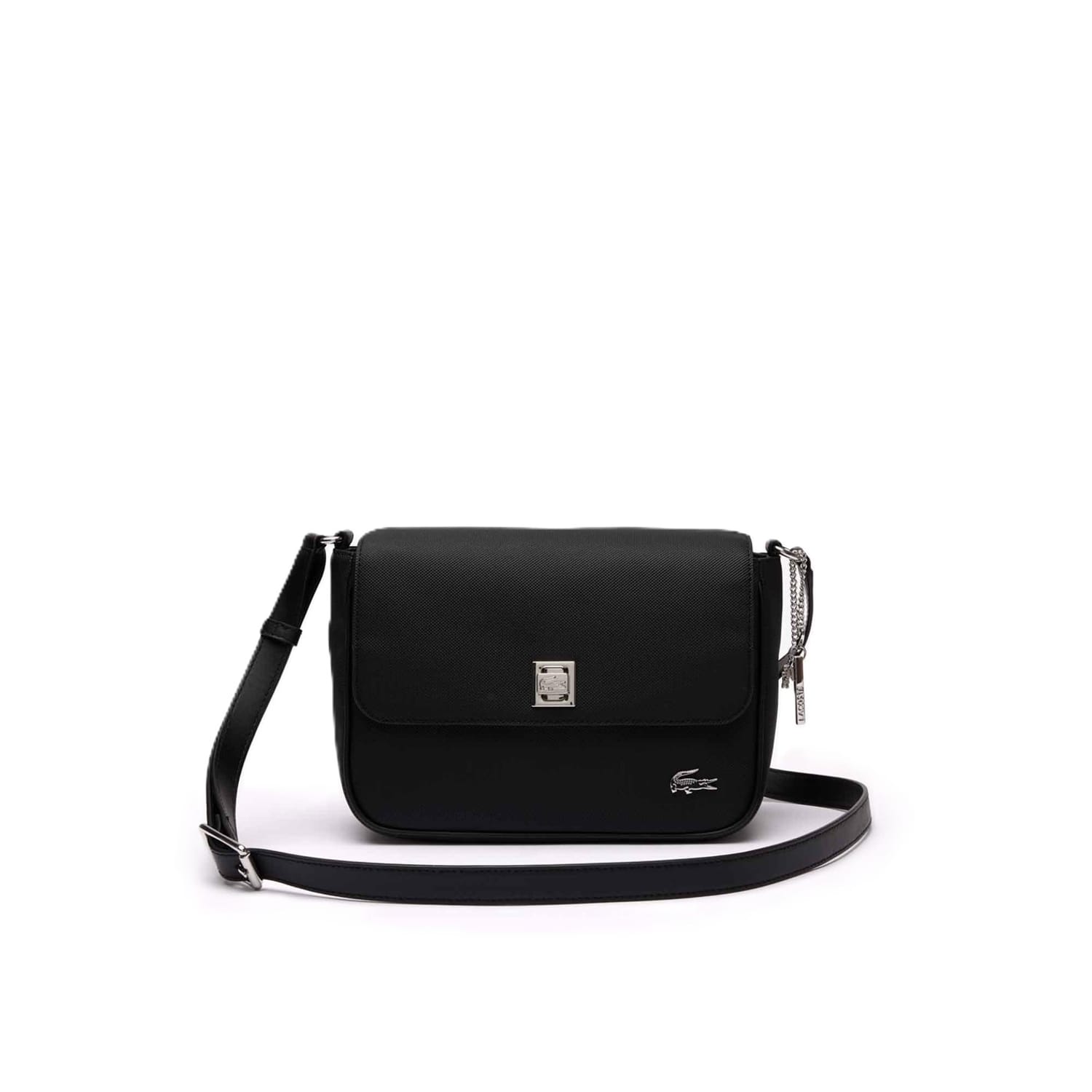 Discover the Lacoste messenger bag, a stylish accessory for your essentials. This bag features a secure zipper closure and a convenient shoulder handle for easy carrying. Adorned with a distinctive logo and chain embellishments, it combines functionality with a touch of elegance, making it a versatile choice for any occasion. -