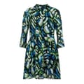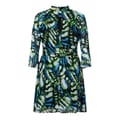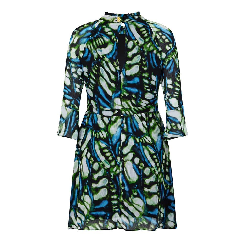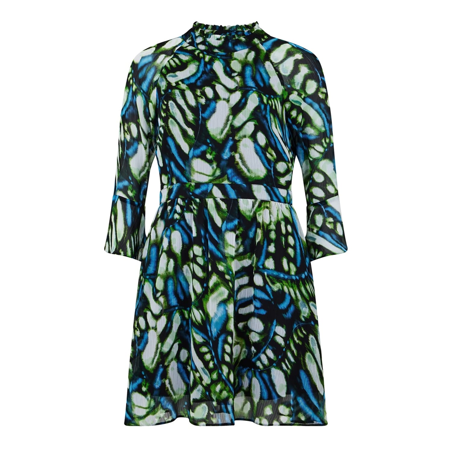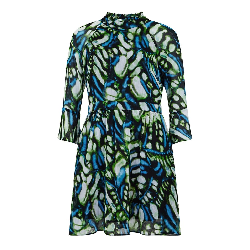 This Biba mini skater dress features a high neck and three-quarter sleeves, offering a stylish and comfortable fit. The dress is adorned with a charming butterfly pattern and ruffle embellishments, adding a playful touch to its design. -