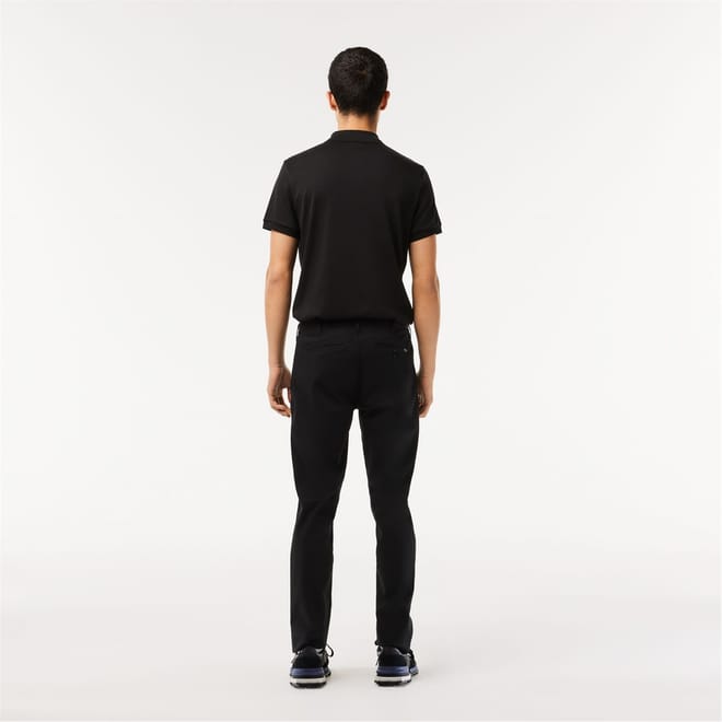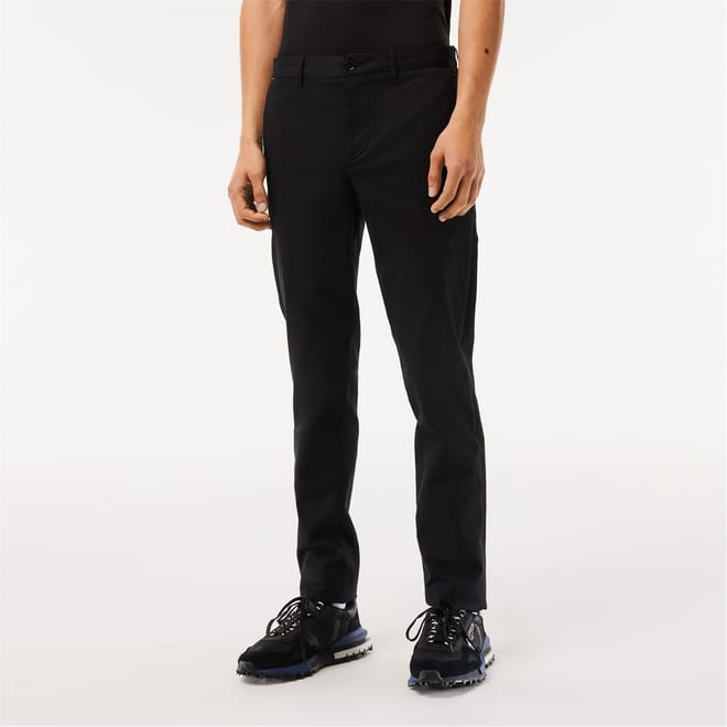 The essential trouser of a Lacoste wardrobe. Timeless chino for a casual look. Made of the ideal weight of stretch fabric it joins Lacoste transitional essential of the masculine wardrobe for a contemporary silhouette. This chino made from organic cotton has been designed in a sustainable approach. Slim fit - Adjusted hip and leg, slightly low waist. Inside waistband made with branded jacquard herringbone and finished by a white binding. Binding at bottom legs