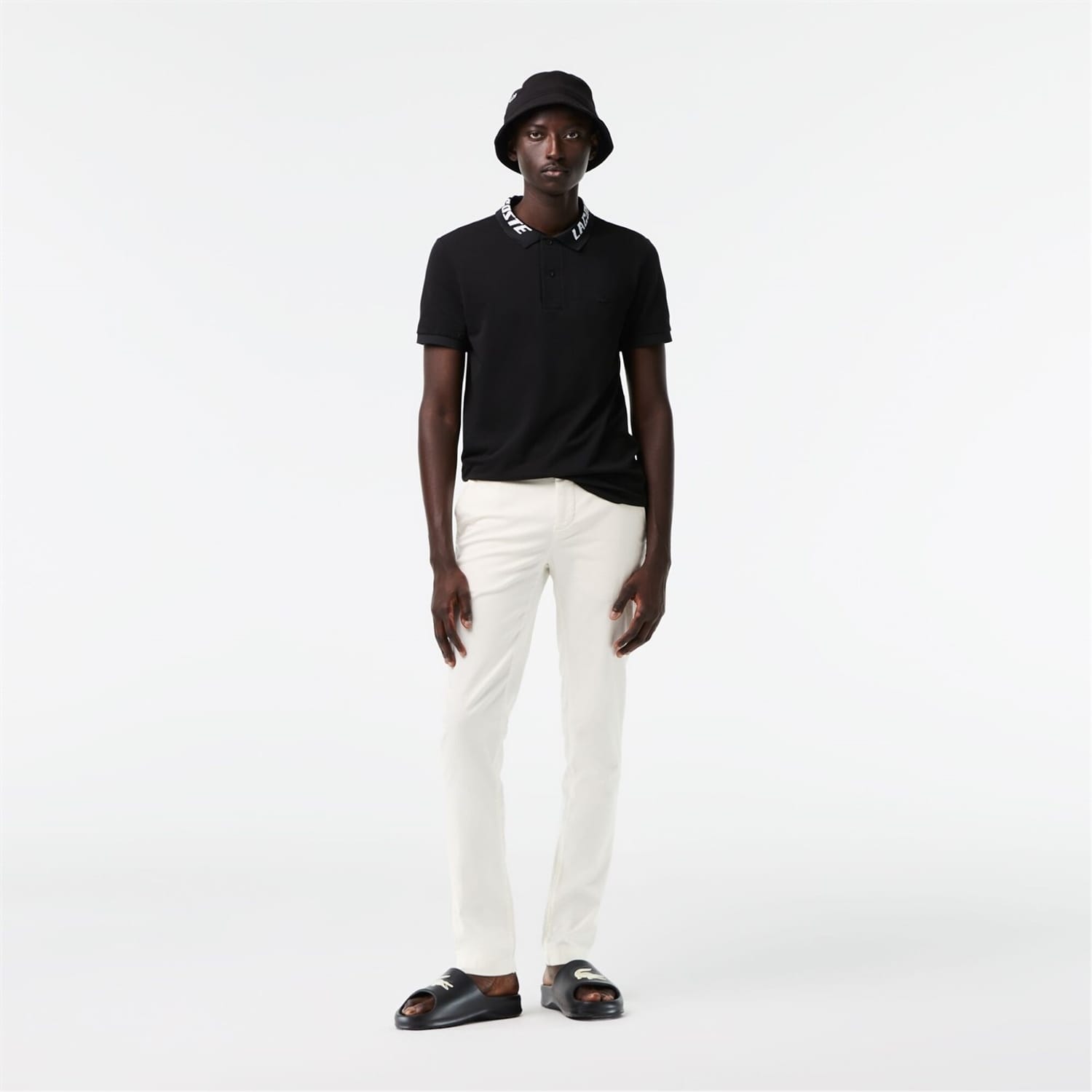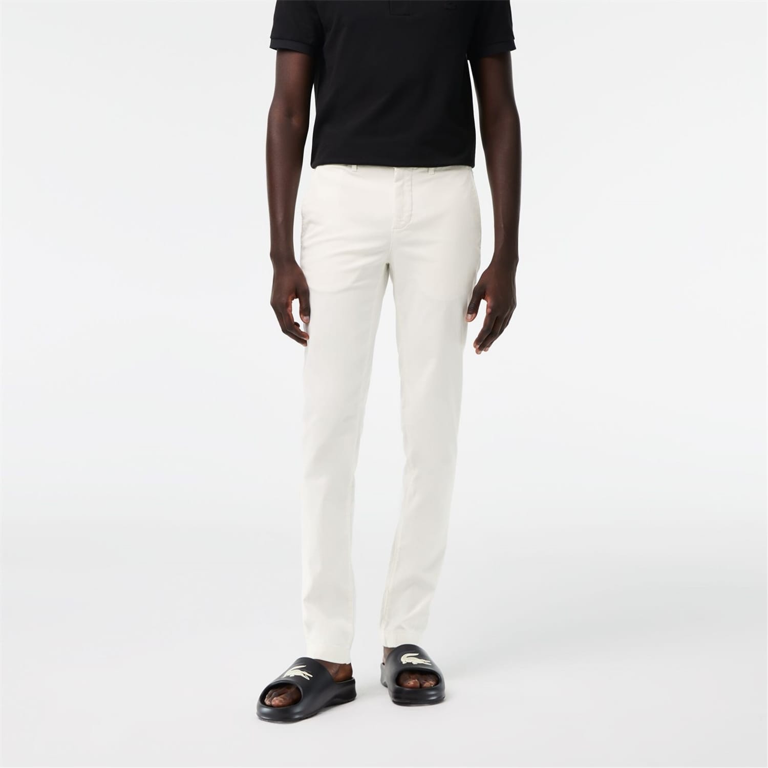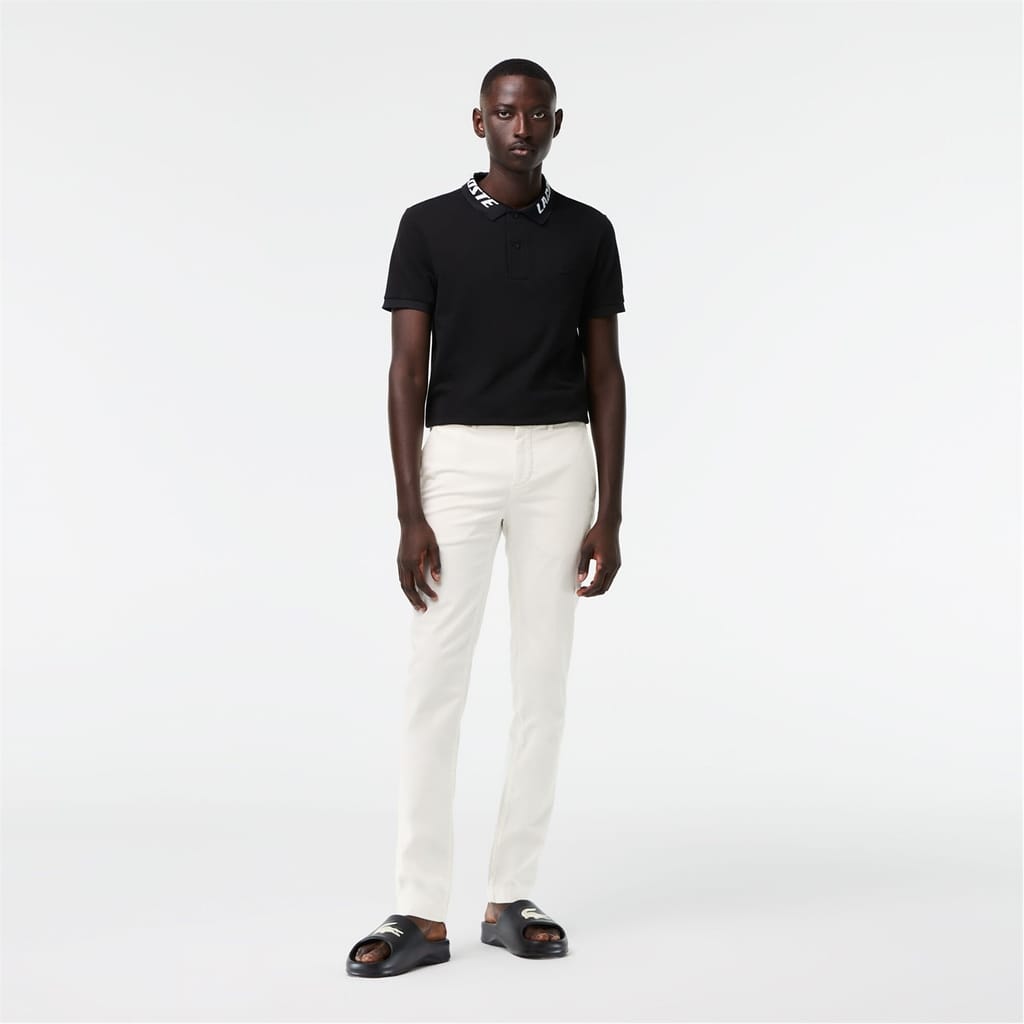 The essential trouser of a Lacoste wardrobe. Timeless chino for a casual look. Made of the ideal weight of stretch fabric it joins Lacoste transitional essential of the masculine wardrobe for a contemporary silhouette. This chino made from organic cotton has been designed in a sustainable approach. Slim fit - Adjusted hip and leg, slightly low waist. Inside waistband made with branded jacquard herringbone and finished by a white binding. Binding at bottom legs