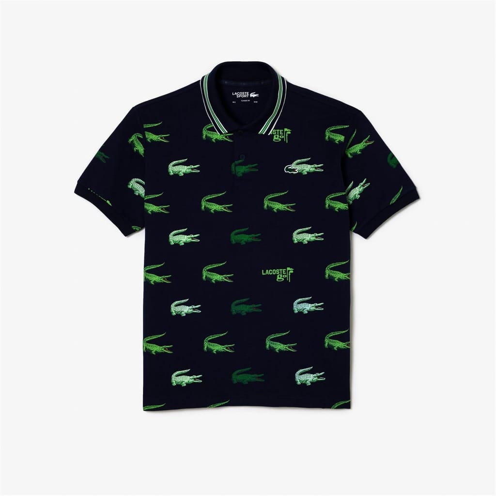Discover the Lacoste polo shirt, combining performance with semi-formal style. This short-sleeve top features a button closure and regular fit, ideal for golf enthusiasts. It boasts a classic polo collar with ribbed cuffs, adorned with an embroidered crocodile logo and animal pattern for a distinctive touch. -