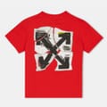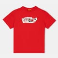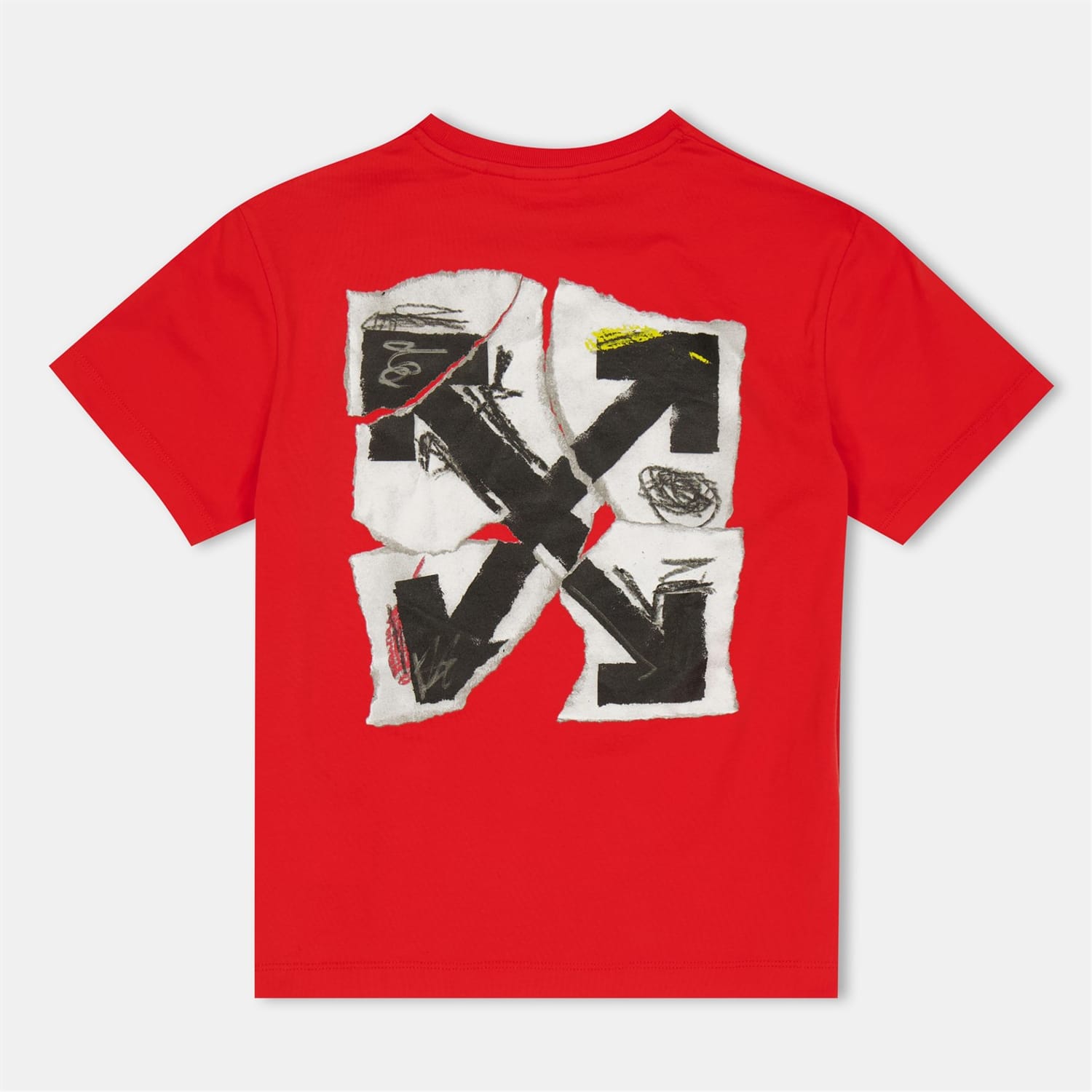This Off White top features a regular fit with a crew neck and short sleeves. The design is enhanced by a striking text graphic print, adding a modern touch. The straight hemline completes the look, making it a versatile addition to any wardrobe. -