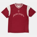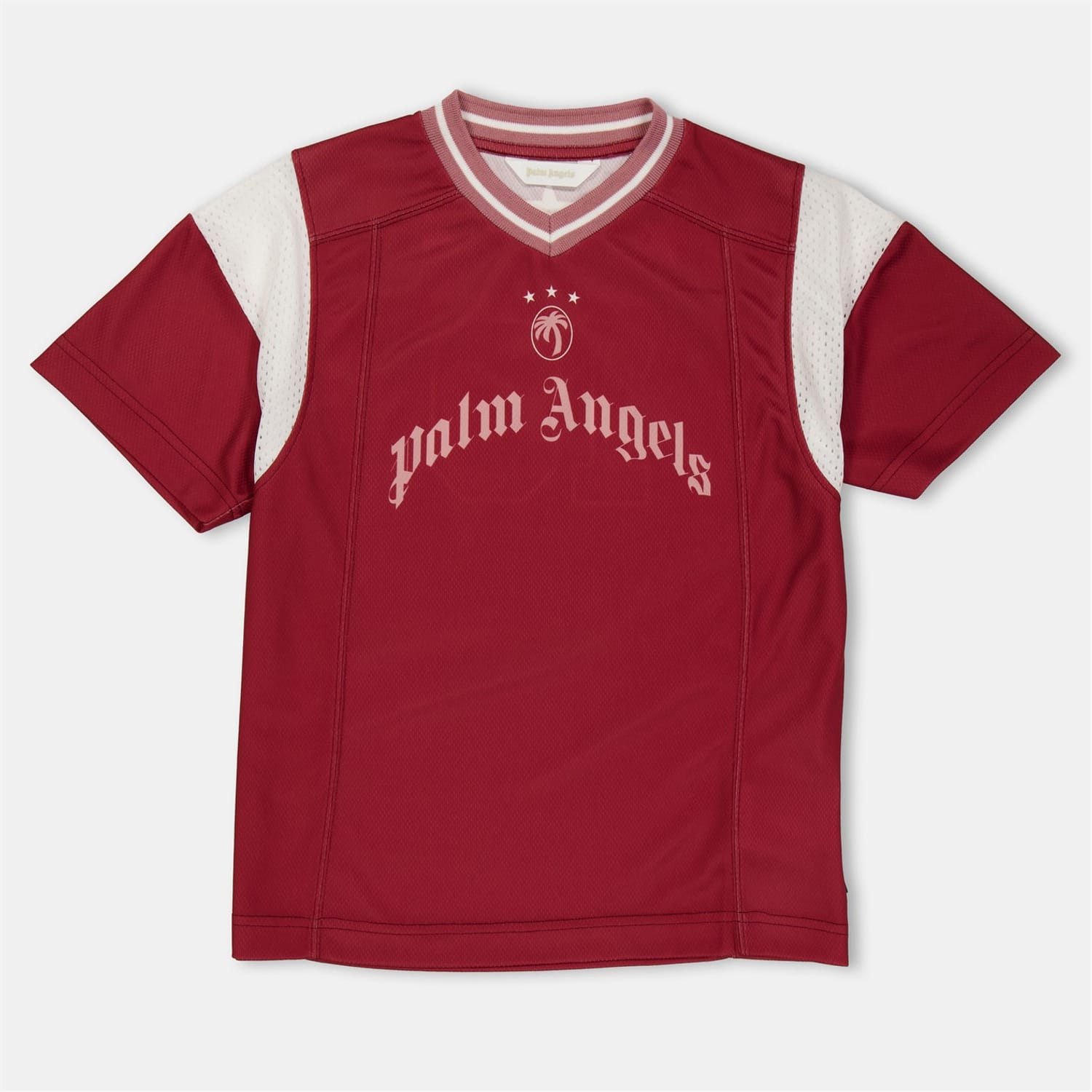 This Palm Angels top features a regular fit with a distinctive graphic pattern. It is designed with short raglan sleeves and a V-neckline, complemented by a ribbed collar for added style. -
