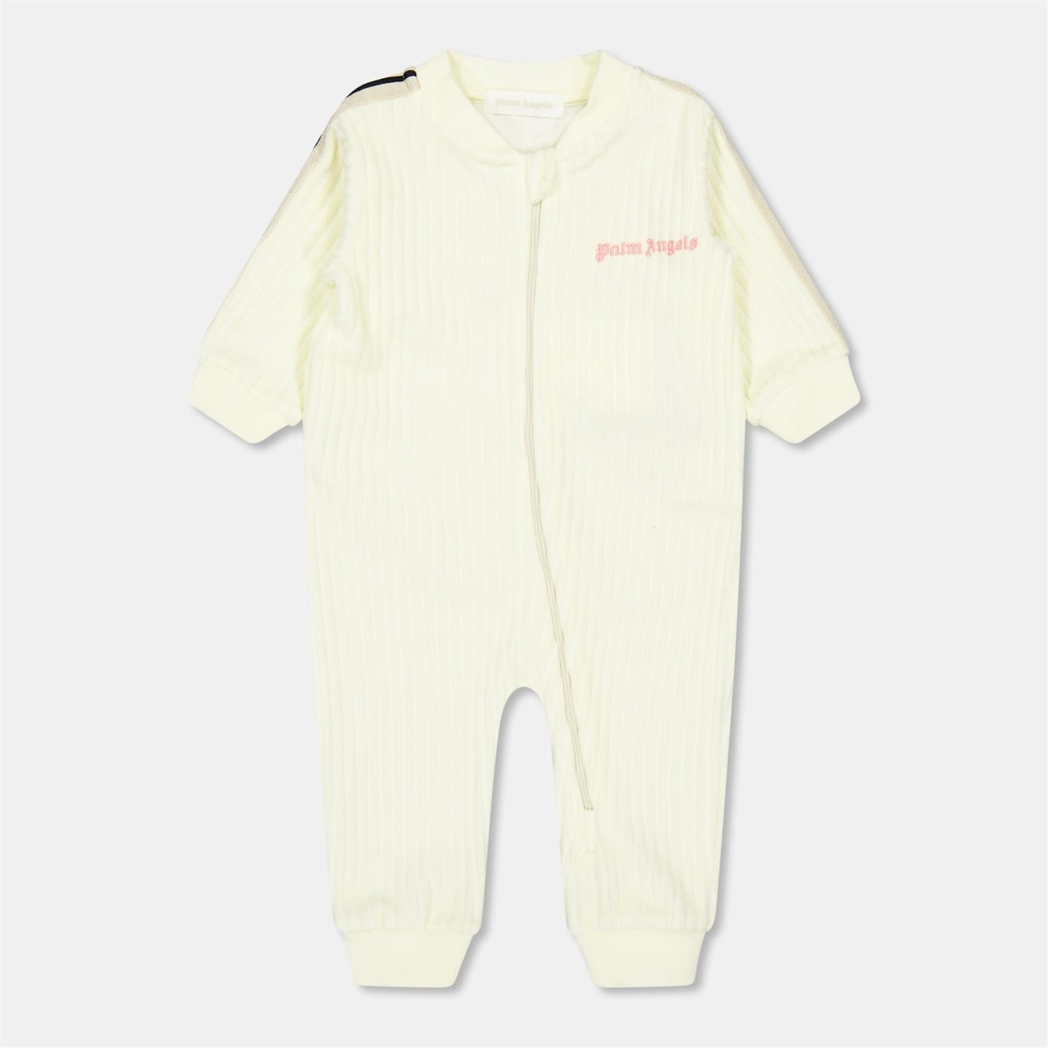 Discover the Palm Angels jumpsuit, featuring a ribbed pattern and crafted with a crew neck and long plain sleeves. This regular fit bodysuit is designed with a convenient zipper closure and showcases a distinctive logo embellishment, making it a versatile addition to your wardrobe. -