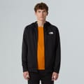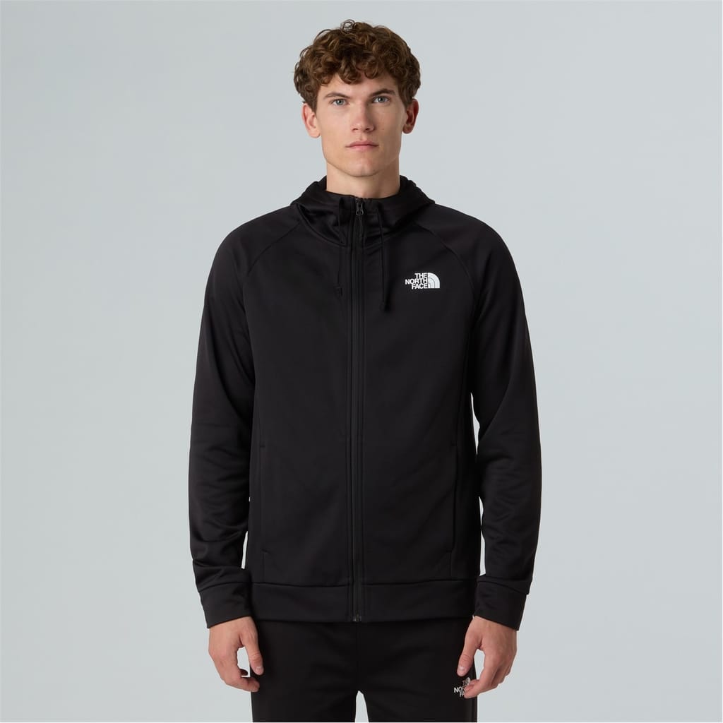 The North Face sweatshirt jacket features a hooded neckline and a full zipper closure. Designed with raglan sleeves and ribbed cuffs, it offers a regular fit for comfort. The solid pattern and straight hemline provide a clean look, while the logo embellishment adds a touch of brand identity. -