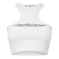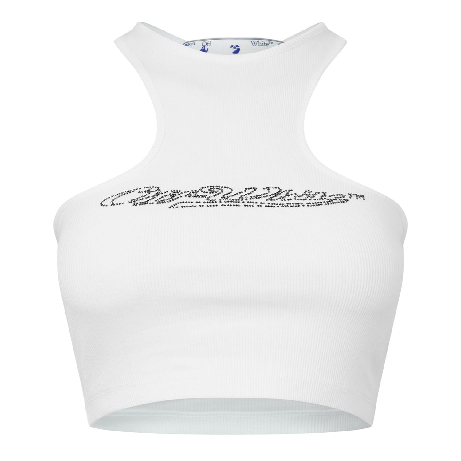 This Off-White tank top features a halter neckline and a sleeveless design, perfect for a stylish and contemporary look. Its cropped length adds a modern touch, making it a versatile addition to your wardrobe. -