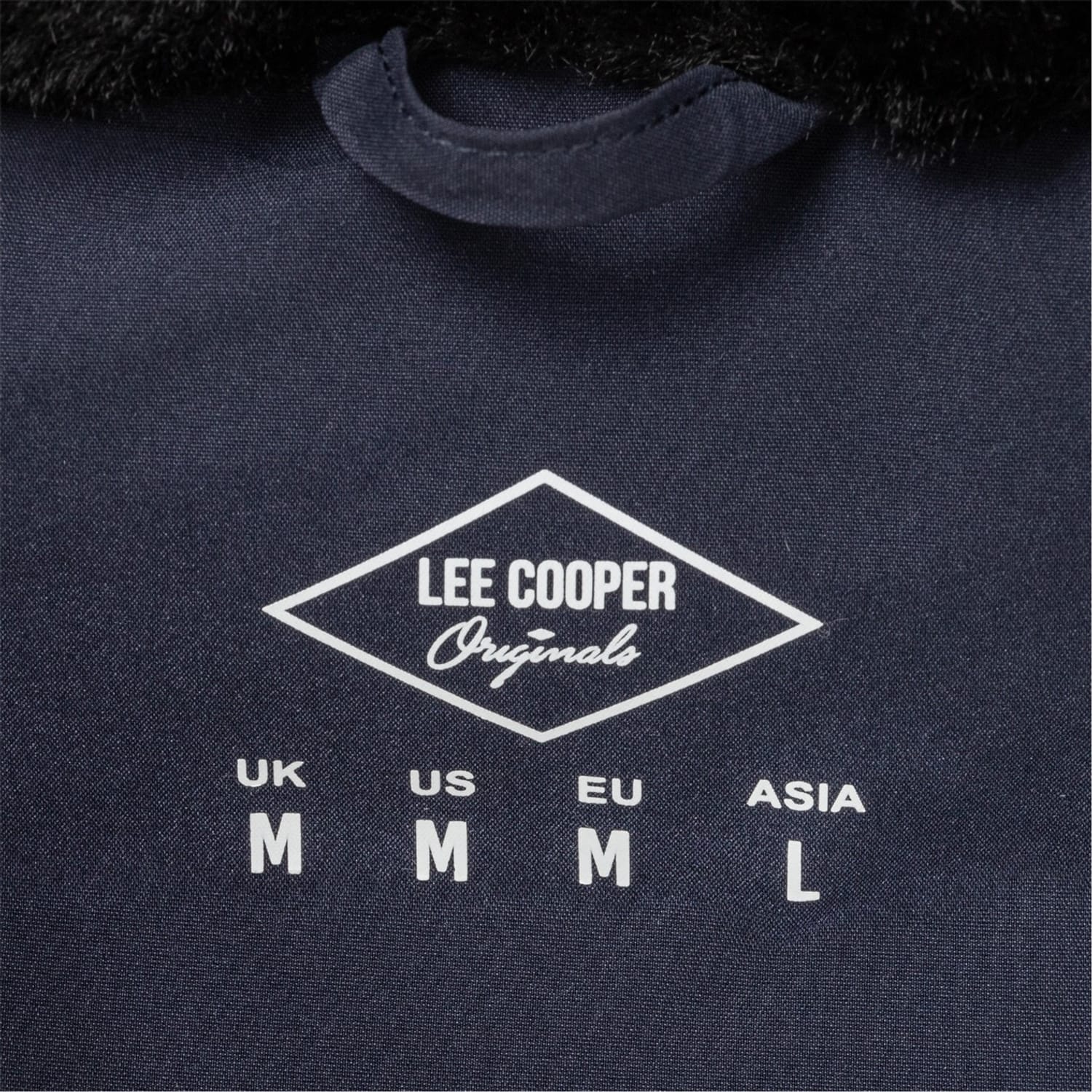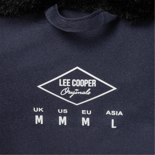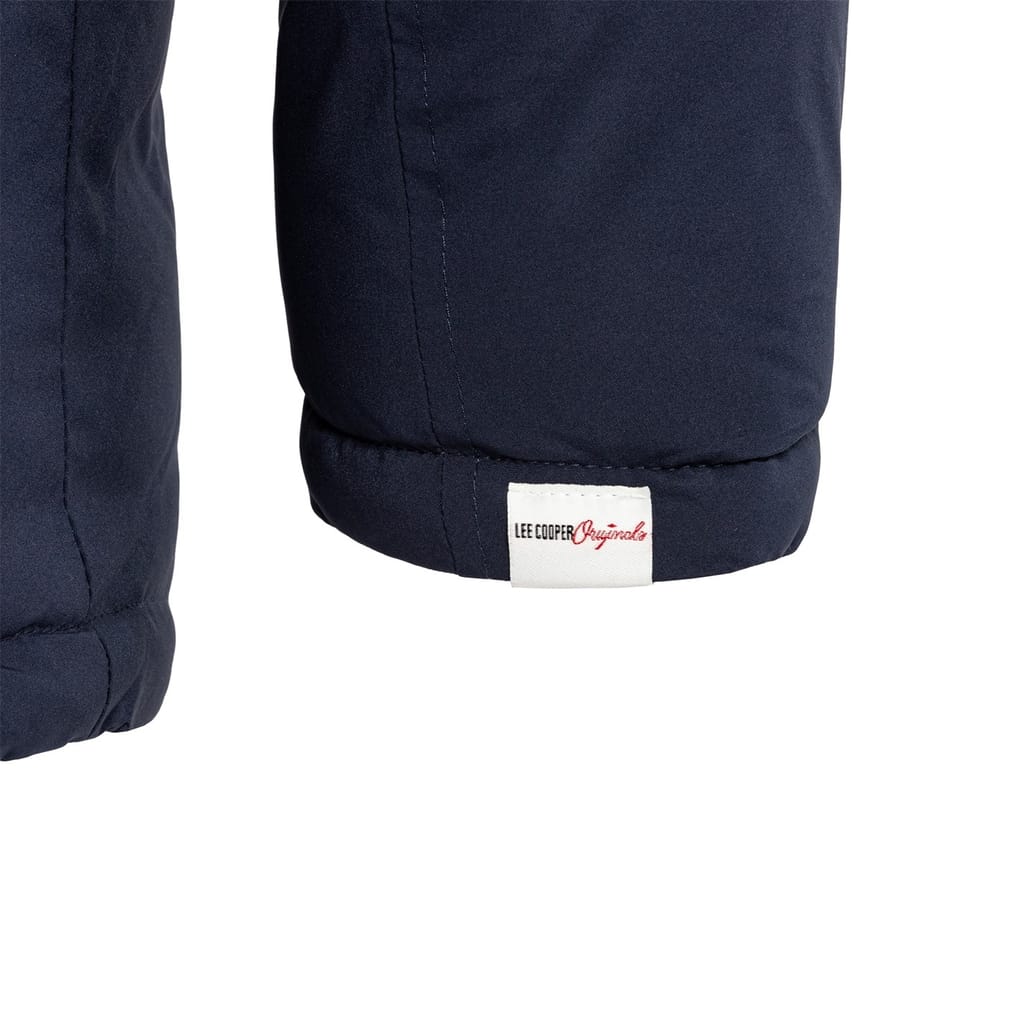 This Lee Cooper parka jacket features a hooded design and a regular fit, offering both style and comfort. The jacket is padded for warmth and includes a zipper and snap button closure for secure fastening. It has a straight hem and ribbed cuffs, adding to its practical appeal. The solid pattern is complemented by logo embellishments and multiple pockets, including zipped options, for added functionality. -