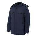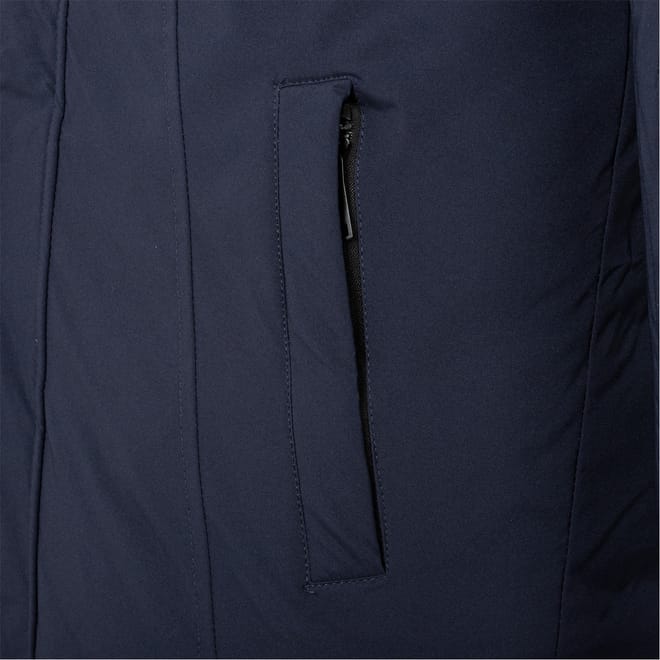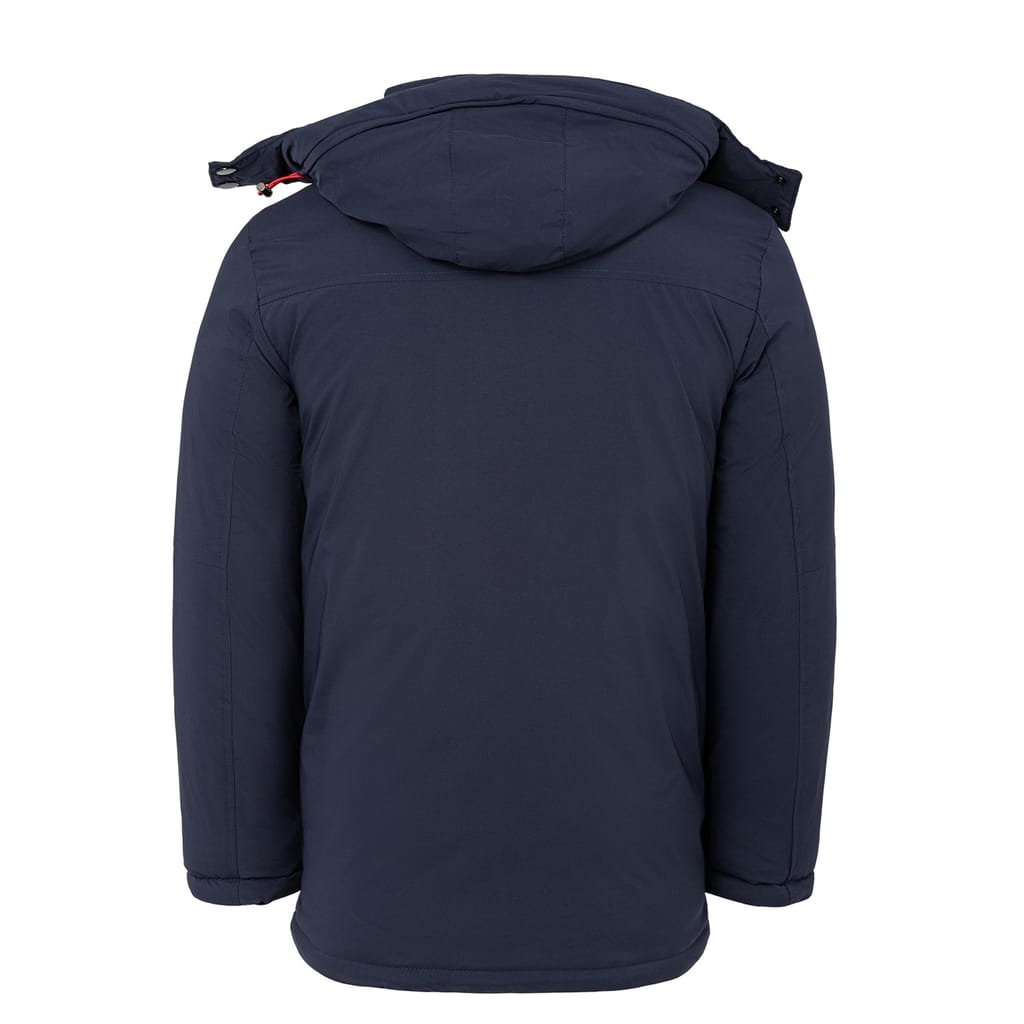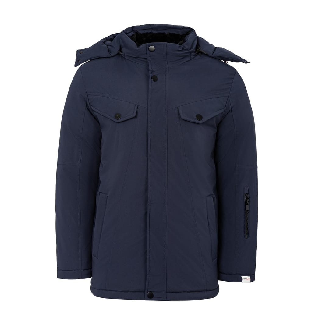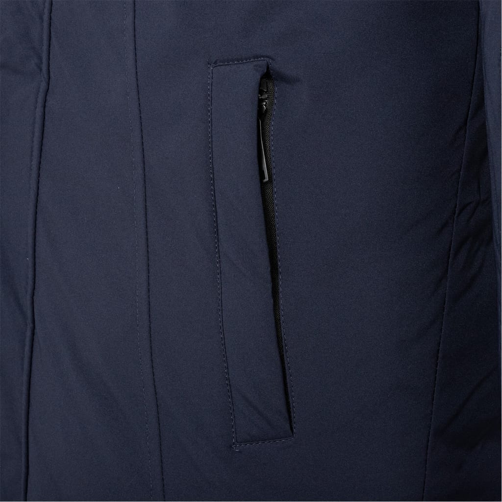 This Lee Cooper parka jacket features a hooded design and a regular fit, offering both style and comfort. The jacket is padded for warmth and includes a zipper and snap button closure for secure fastening. It has a straight hem and ribbed cuffs, adding to its practical appeal. The solid pattern is complemented by logo embellishments and multiple pockets, including zipped options, for added functionality. -